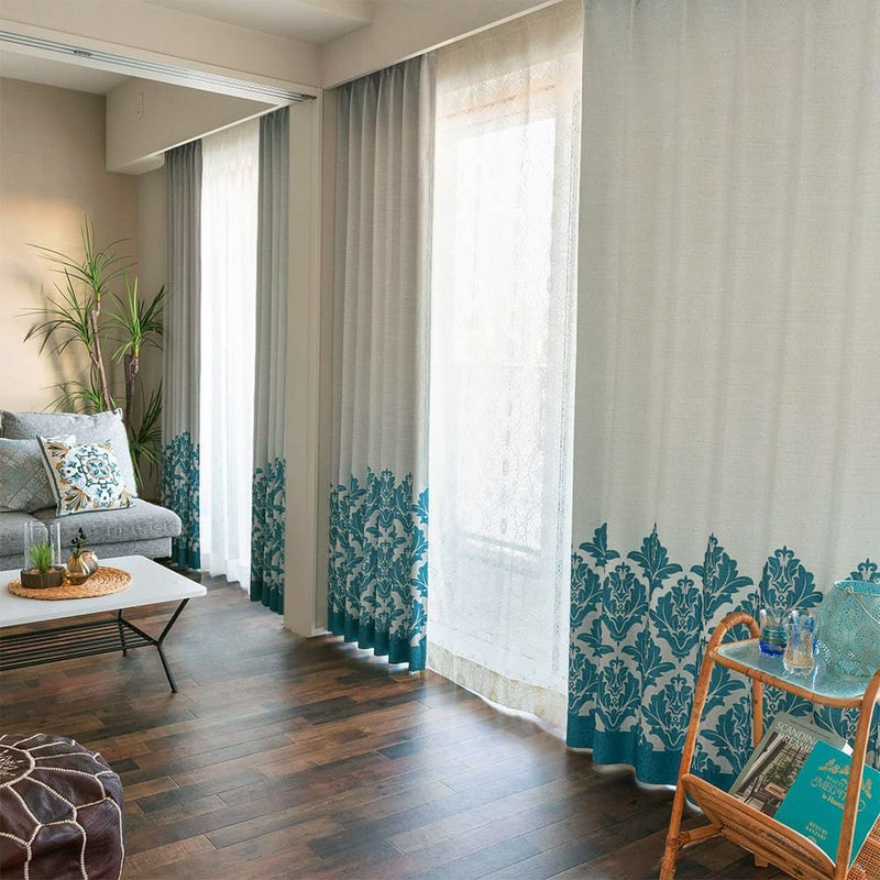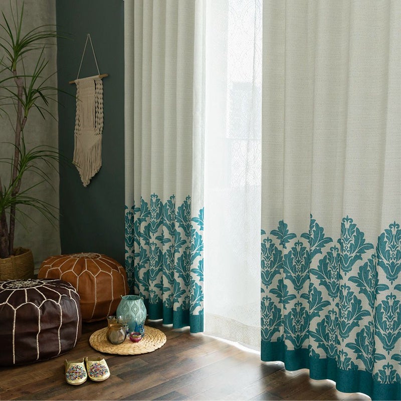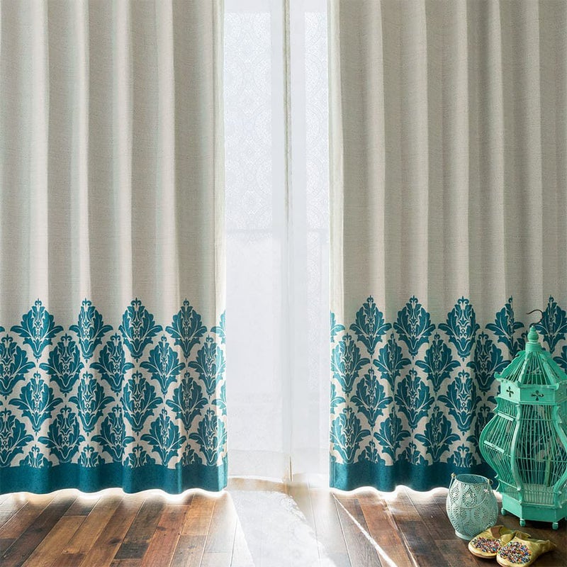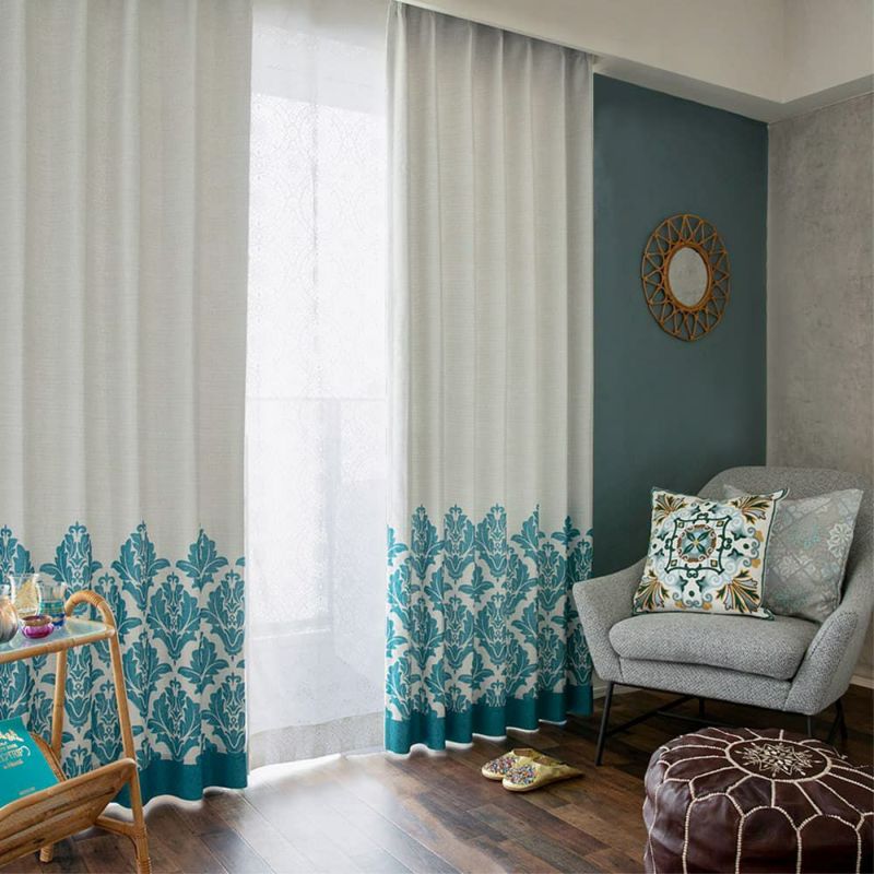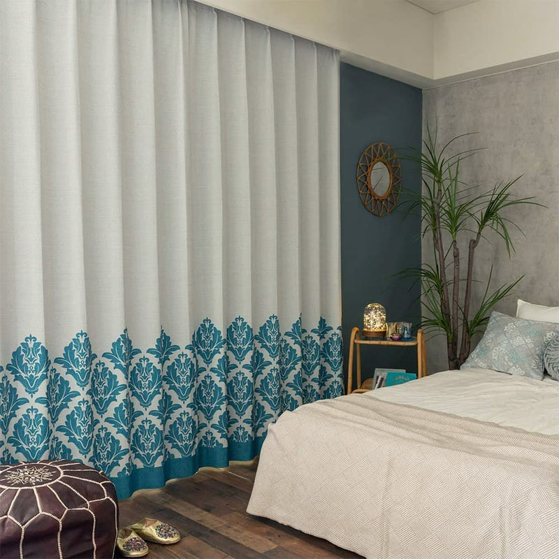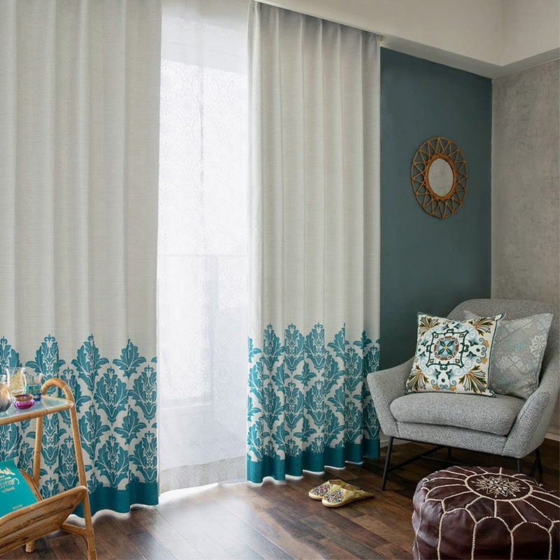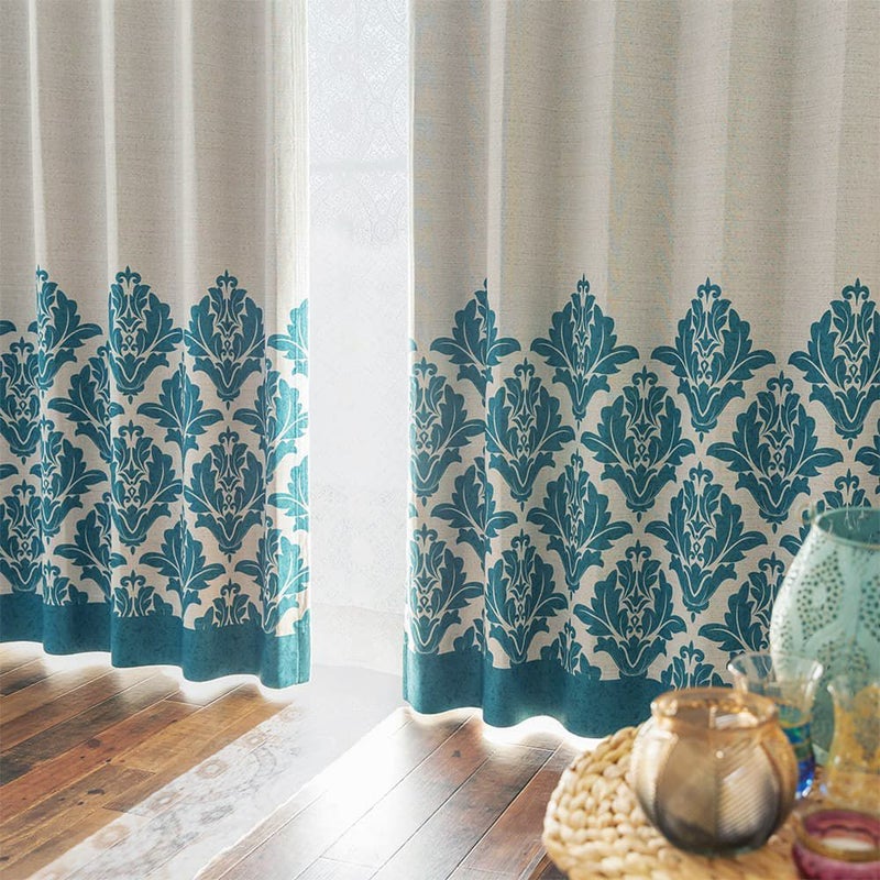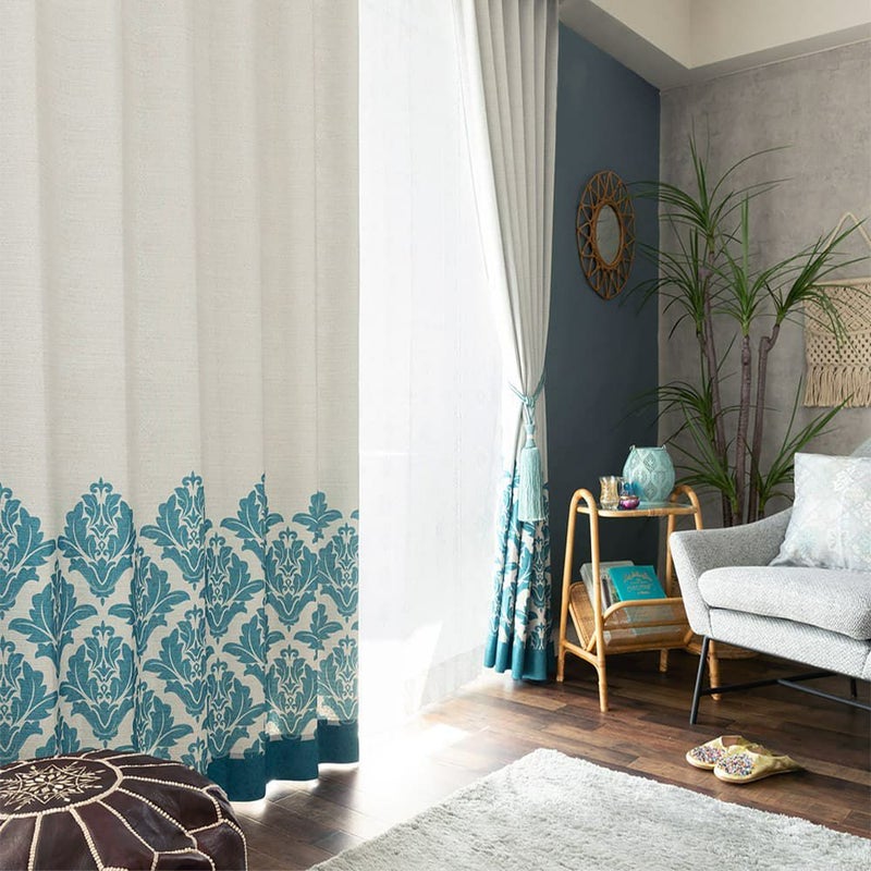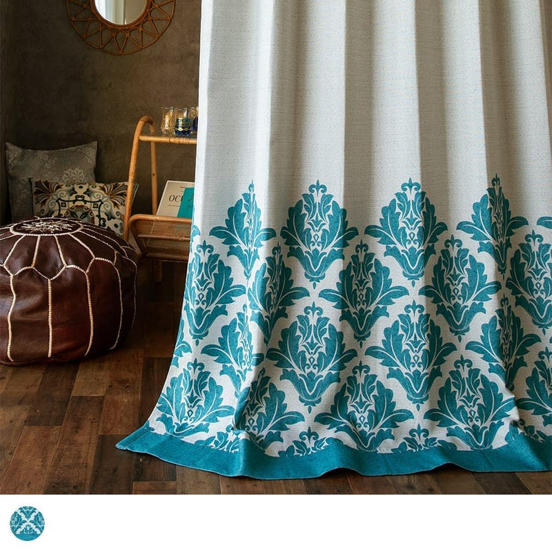 一見難しく思えるエスニック系インテリアやモロッコインテリアを、もっとお洒落にもっとハイセンスに楽しめるよう考え、絵羽柄と呼ばれる生地の一部にデザインを施したオリジナルカーテン。