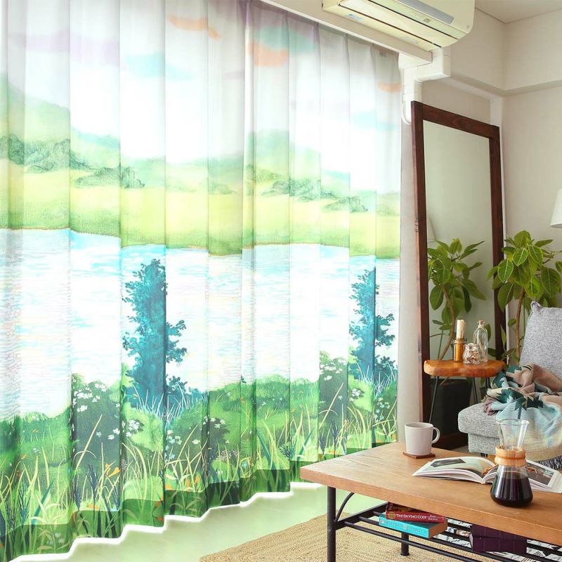霧ヶ峰の湿原をイメージして描かれた湖の風景画を、スケール満点にデザインしたアートなアウトドアカーテン。湖畔の雄大な風景を部屋に持ち込み、いつでも大自然に囲まれたあの開放感を味わえるオーダーカーテンだ。 -