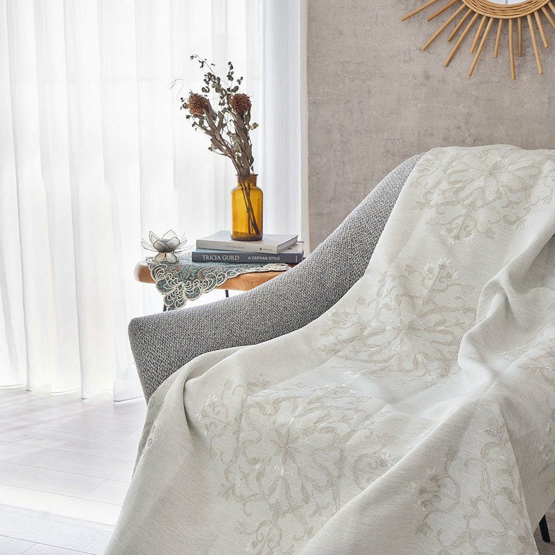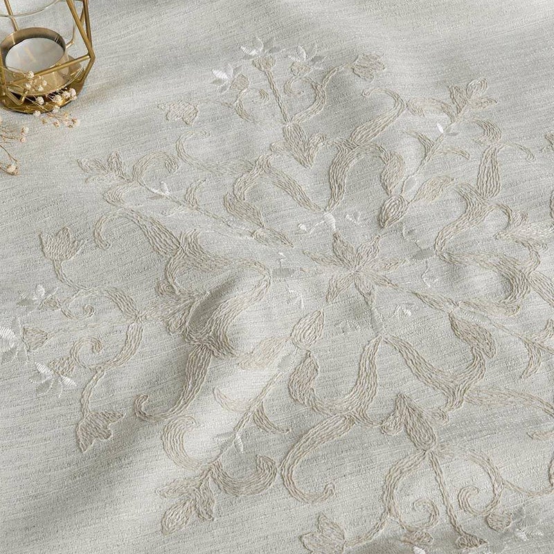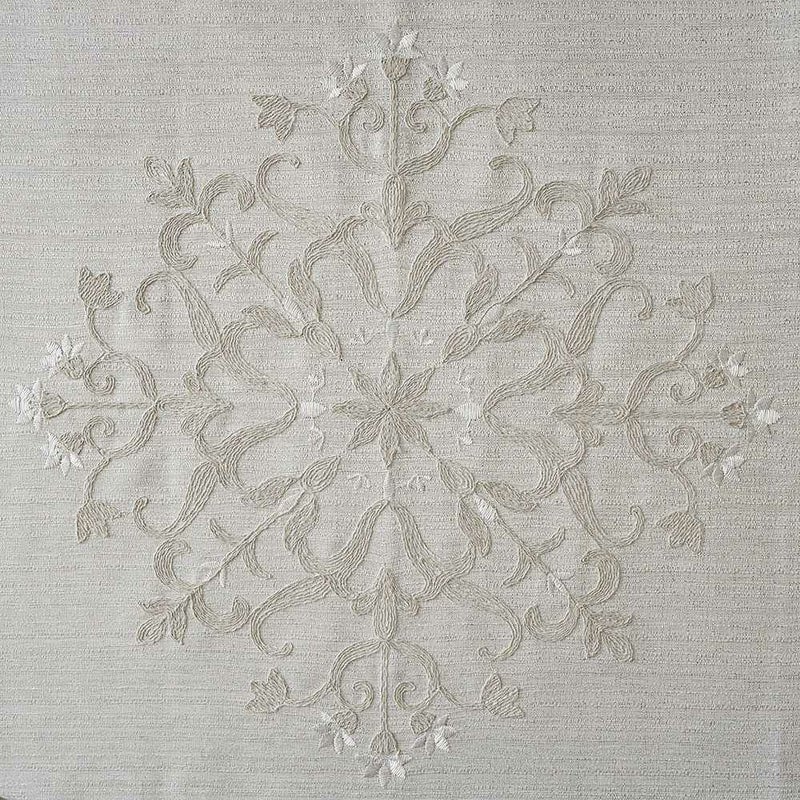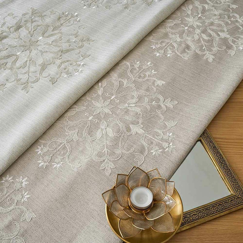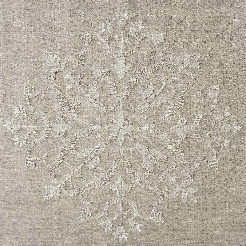 大胆な大きさのオーナメント柄の刺繍が、オリエンタルな雰囲気をいっそう引き立てます。更に、繊細な刺繍糸が描き出すオーナメントは、立体的な陰影を生み、深みのある優美な表情を醸し出します。