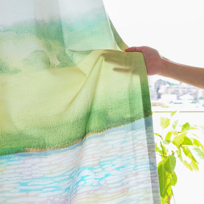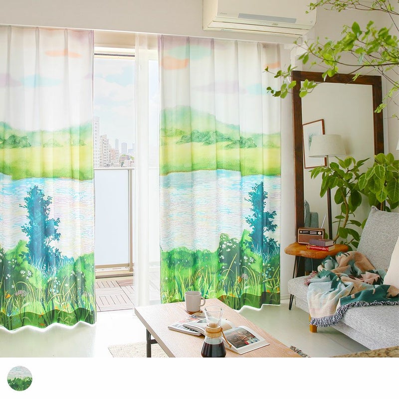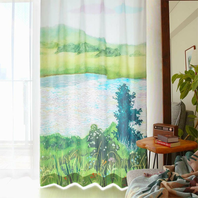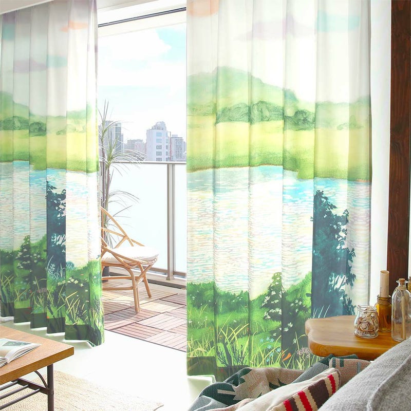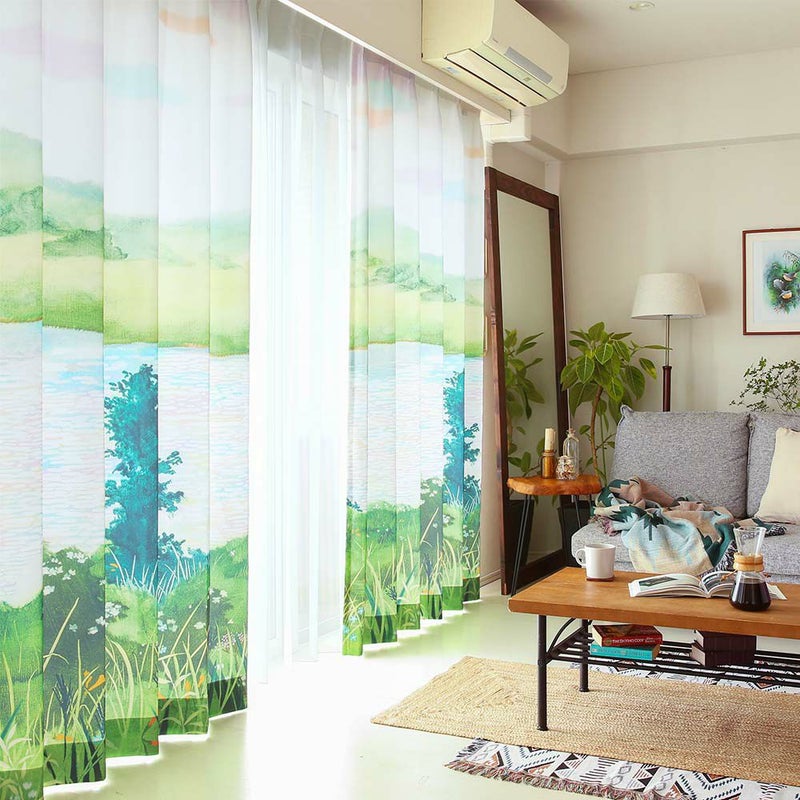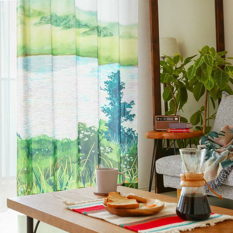 霧ヶ峰の湿原をイメージして描かれた湖の風景画を、スケール満点にデザインしたアートなアウトドアカーテン。湖畔の雄大な風景を部屋に持ち込み、いつでも大自然に囲まれたあの開放感を味わえるオーダーカーテンだ。 -