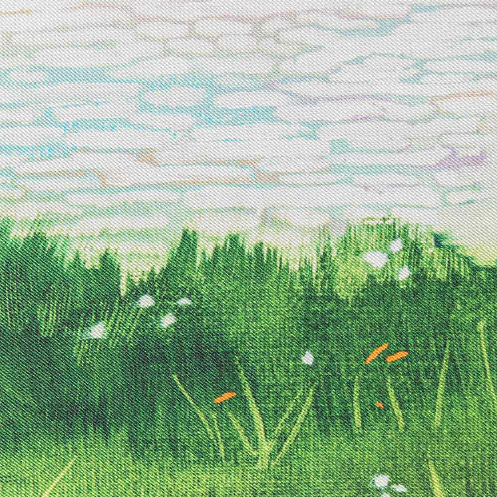 国の天然記念物にも指定されている「霧ヶ峰」。そこにある美しい湖、ほとりに咲く数々の高山植物が、絶妙な色使いで表現されたデザイン。淡いカラーリングは、陽に透けるとより鮮やかになり、その美しさは見る者に感動を与えてくれる。