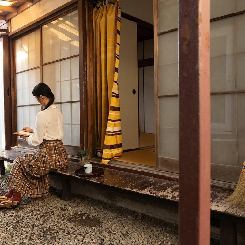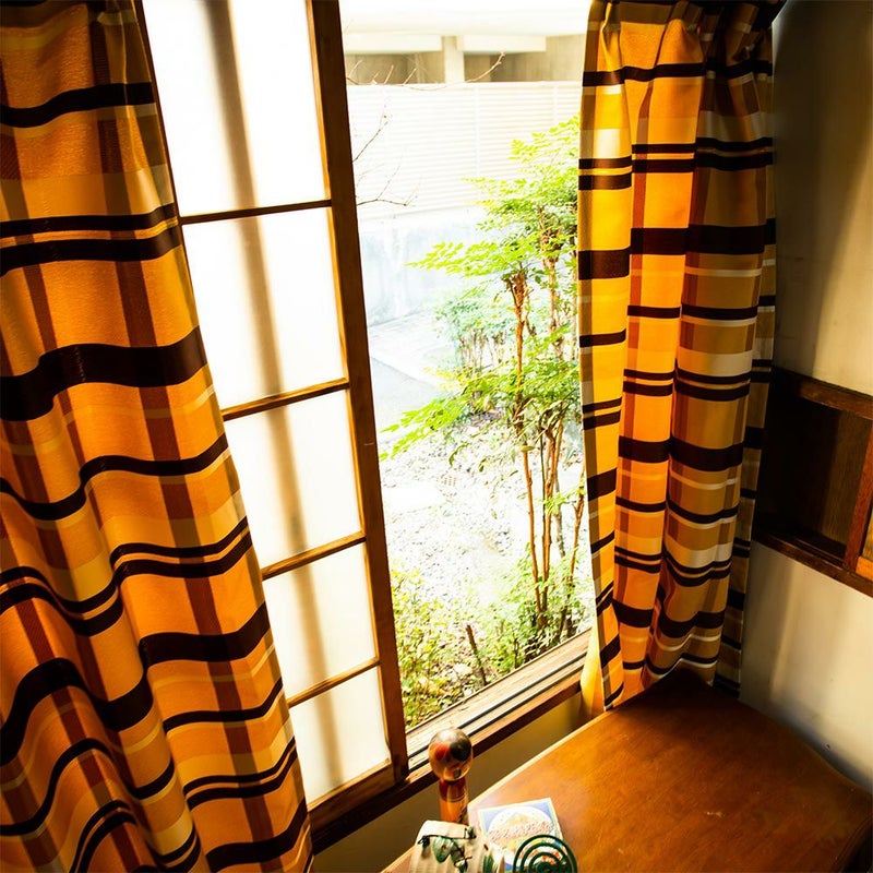 縁側から見たところも様になる、リバーシブル感覚のカーテン