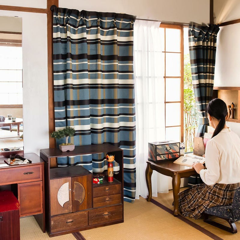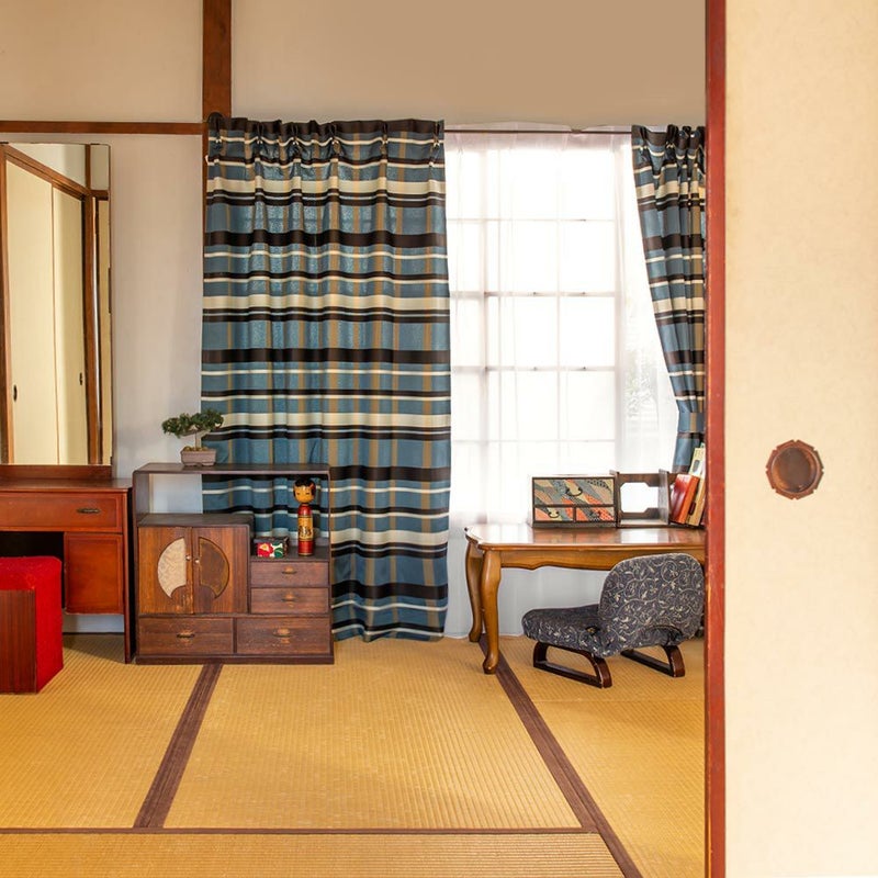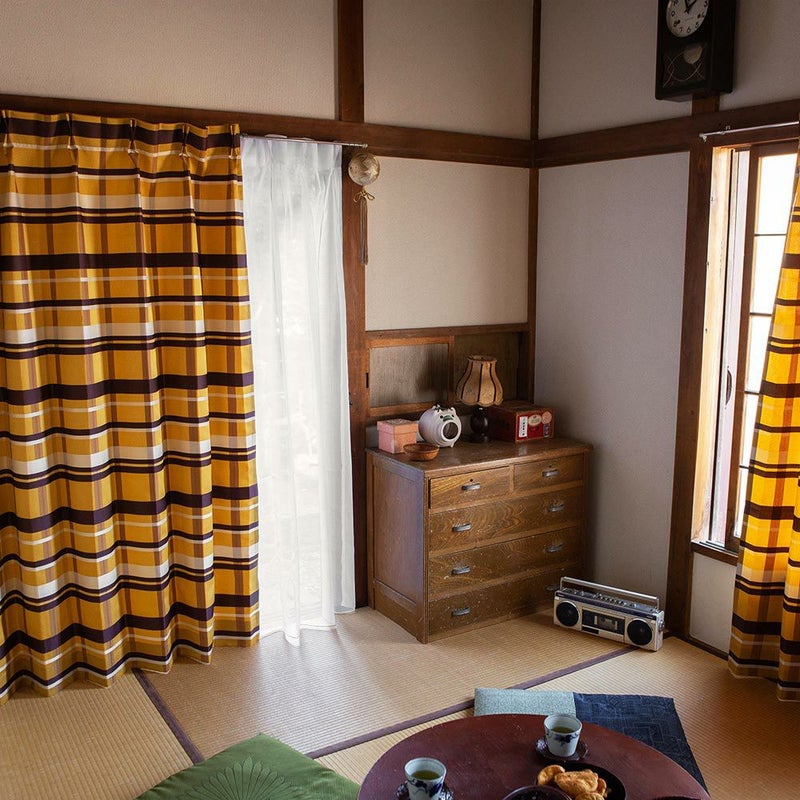 おばあちゃんからもらった古家具に囲まれたレトロな部屋。そこにパンチの効いたハイカラな格子柄のカーテンをかけたら、いっきに昭和へタイムトリップ♪