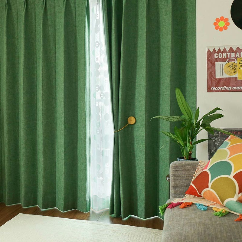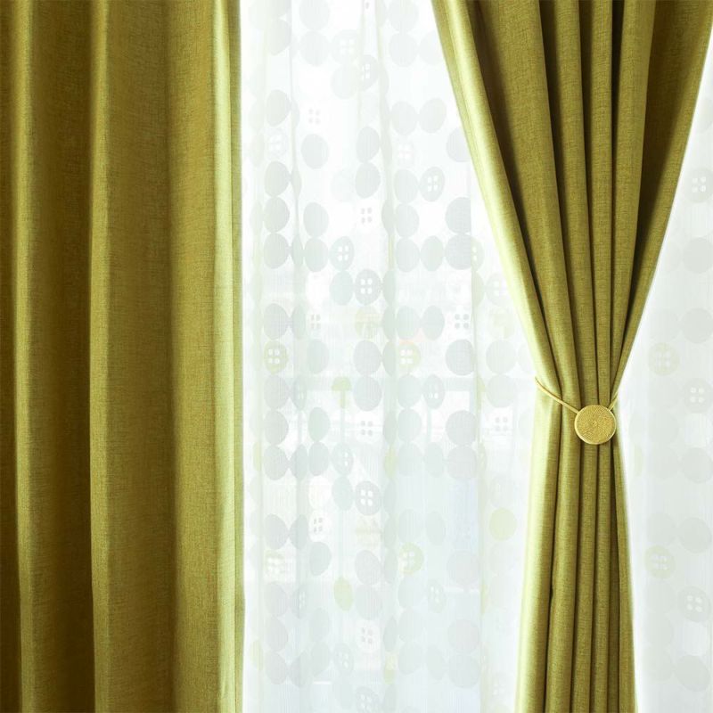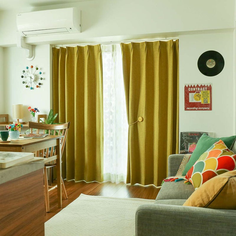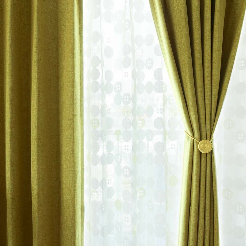 【撮影コーディネート】レースカーテン<ボタンレース>グリーン タッセル<ガレット> イエロー1級遮光のカーテンは、しっかりと光を遮って、心地よい空間を作り、2級遮光は、程よい明るさをキープして強い陽ざしから部屋を守ってくれます。*色によって遮光等級が異なります。 そして、遮熱57.7%・保温29.5%の効果で、室内の空気をのがさず、1年中快適な部屋に。