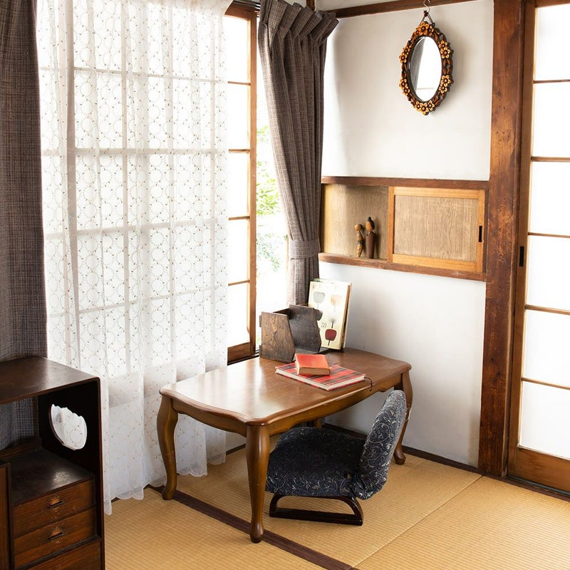 畳の部屋、古びた家具、レトロな雑貨達、、こんな部屋に似合うレースカーテンは、探すと意外とないものですが、ムーンはレトロな和室にぴったり。