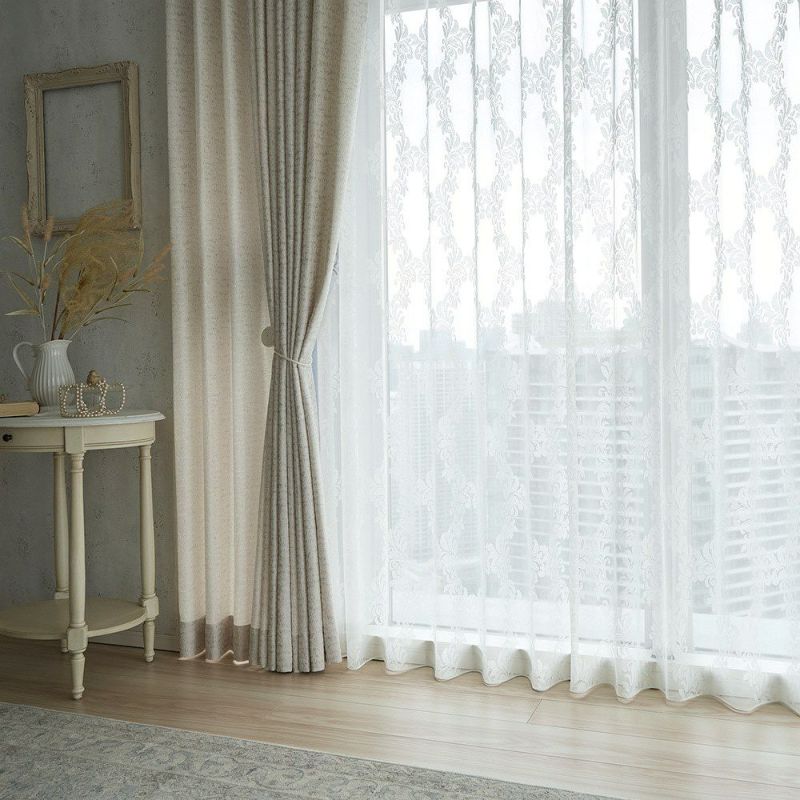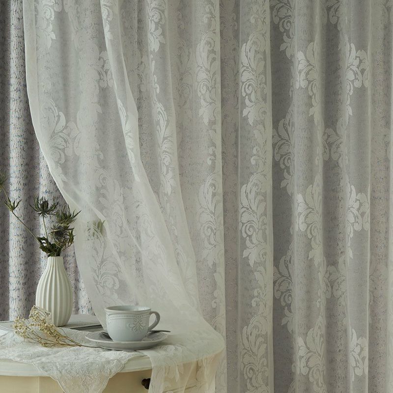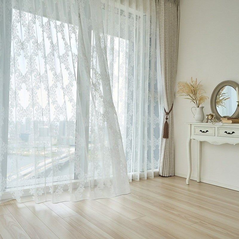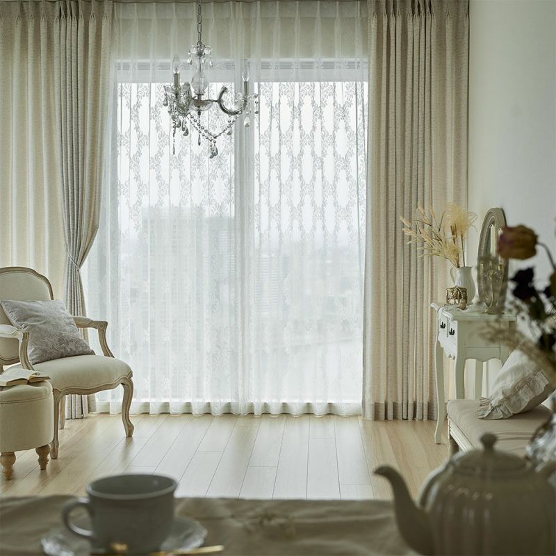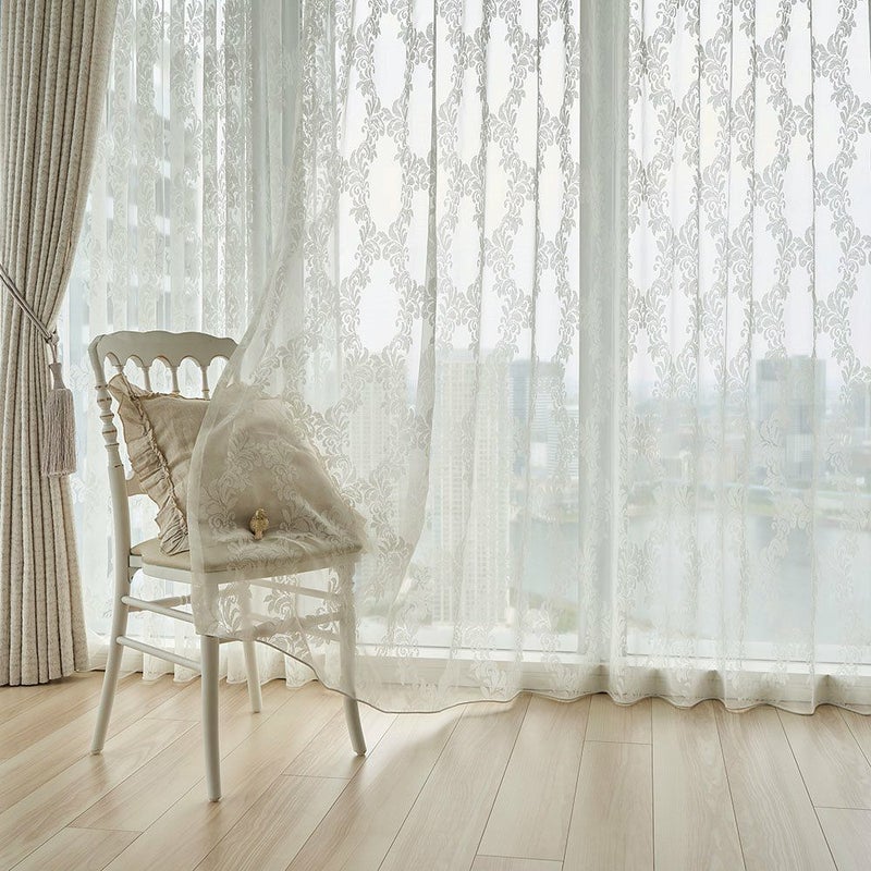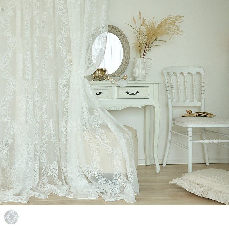 色あせたホワイトのアンティーク家具、そっと揺れるシャンデリアの灯り…。まるでクラシカルな洋館のサロンのようなシャビーシック空間。 そんな世界観に寄り添うのが、このダマスク柄のレースカーテンです。