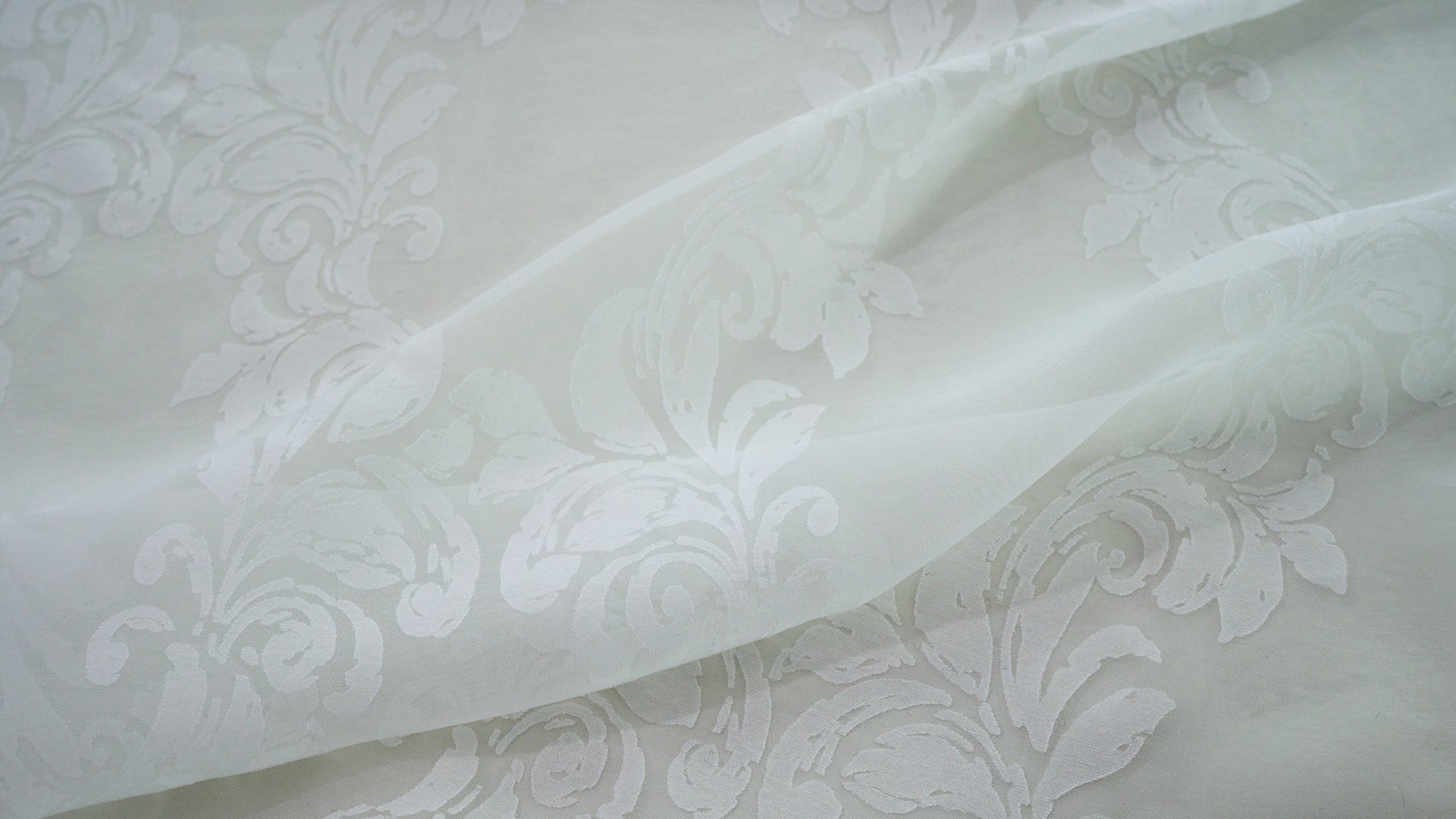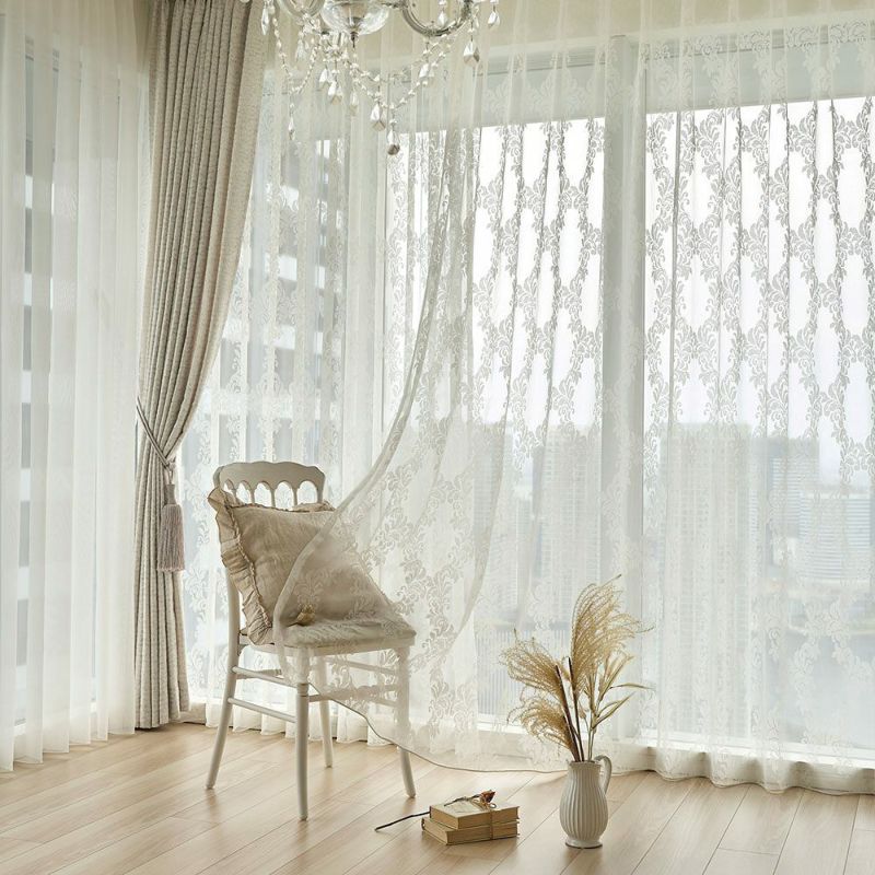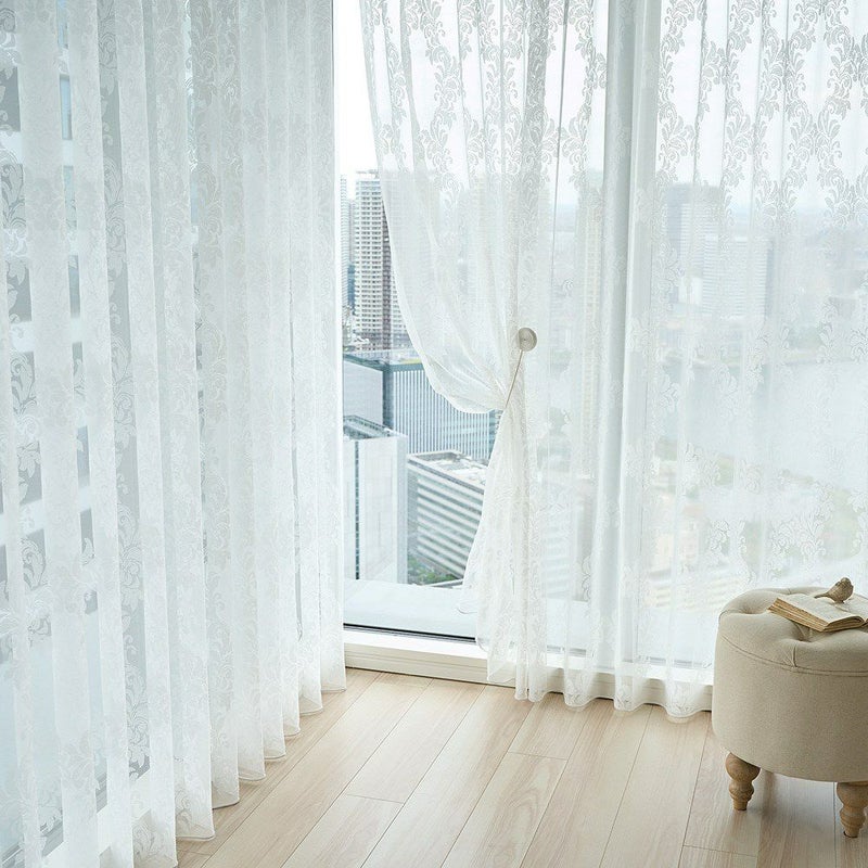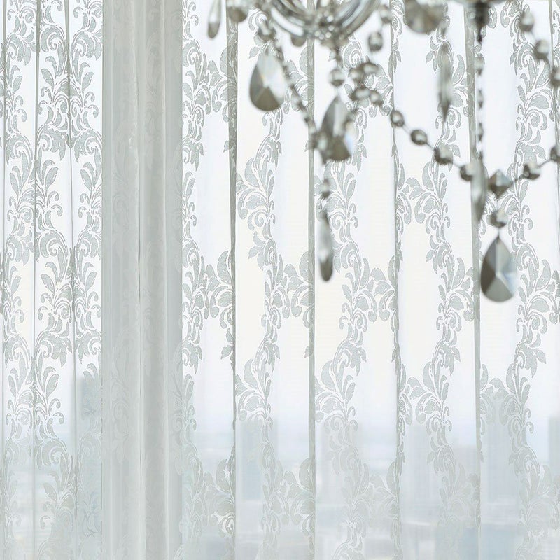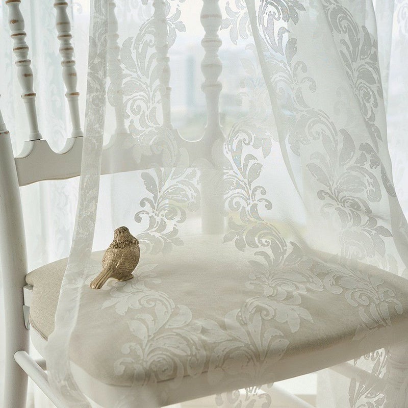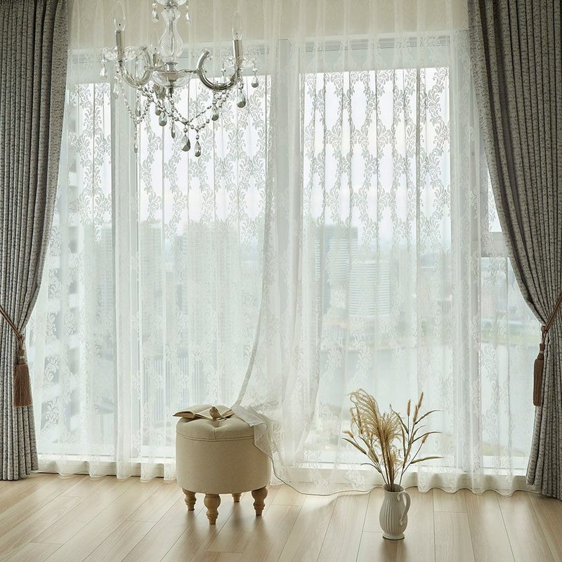 色あせたホワイトのアンティーク家具、そっと揺れるシャンデリアの灯り…。まるでクラシカルな洋館のサロンのようなシャビーシック空間。 そんな世界観に寄り添うのが、このダマスク柄のレースカーテンです。