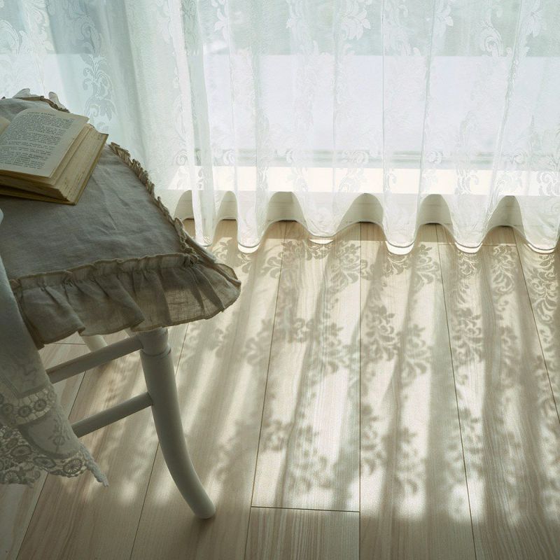 光を受けると、床にまで柄が映し出され、まるで柔らかな木漏れ日のよう。 カーテンがふわりと揺れるたびに、影のかたちがゆるやかに移ろい、眺めているだけで心がときめきます。