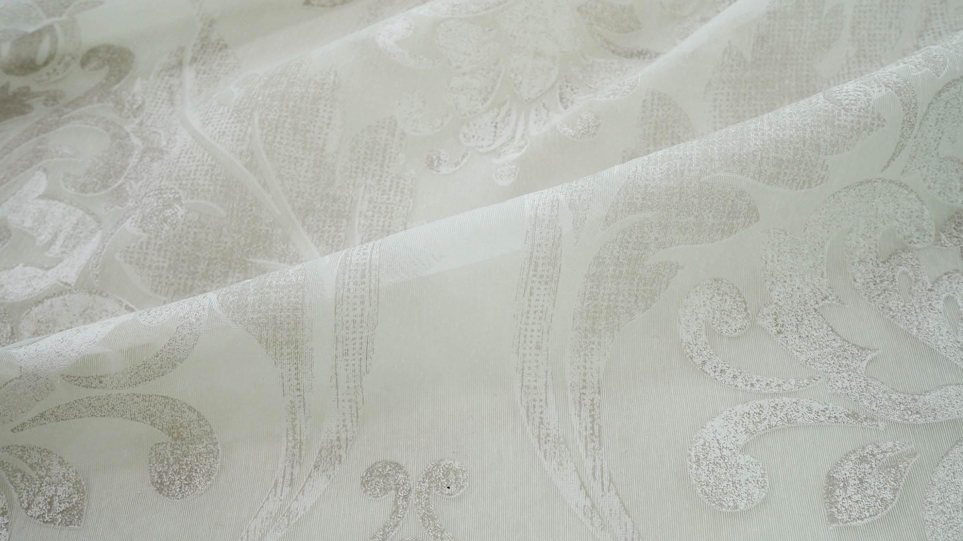 洗練されたシャビーシックな空間にふさわしい、繊細で美しい佇まいのな一枚です。 ホワイトのベースにナチュラルなキナリ色の模様は、どんな空間にも、またどんなドレープカーテンにも自然に馴染み、静かに華やぎを添えてくれます。 -