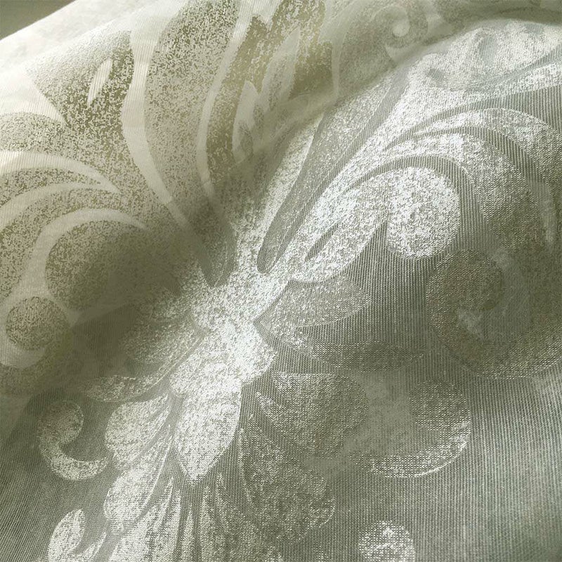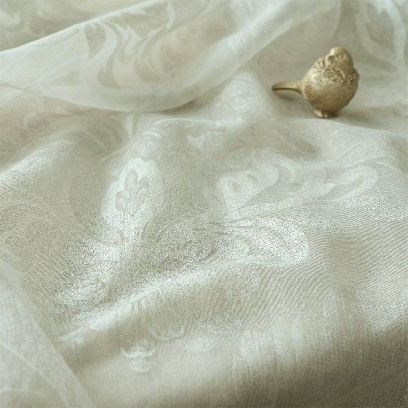 朝の光を受けて、ふんわりと浮かび上がる繊細なダマスク柄のレースカーテン。 オパールプリントならではの透かし模様が、窓辺にほのかなニュアンスを添えます。
