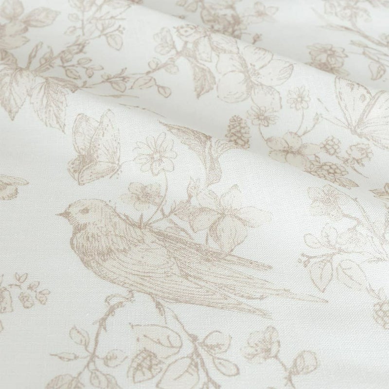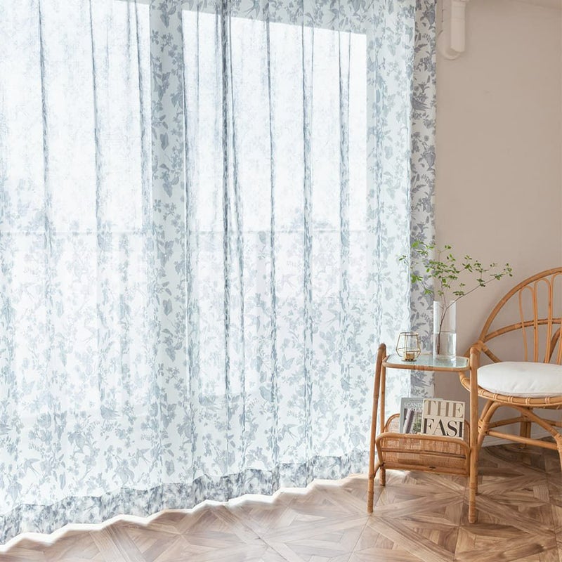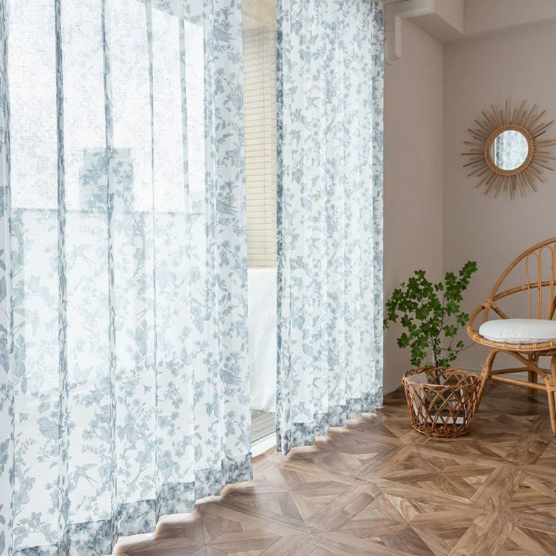 ネイビー、ベージュの2色をご用意。素敵な絵のように花と鳥がカーテンの中で遊び回る美しいデザイン。天然素材のようなナチュラル感のガーゼ織で、シャリ感が涼し気な風合いです。
