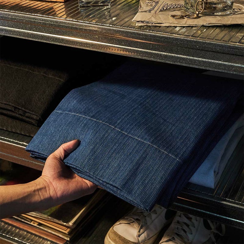 インディゴの重厚さを残しつつ、抜け感を持たせたブリーチデニムは、部屋全体のトーンを和らげる。 光を受けて柔らかく反射し、ストリートのラフさと、インテリアの洗練が交差する。“明るいけど浅くない”。そんな空間をつくるキーアイテムだ。