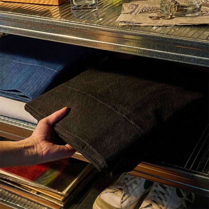実際にアパレルブランドでも使用される、リアルなアパレル用素材を贅沢に落とし込んだ。 13オンスのしっかりとした重量の中に、糸の撚り感、表面のなめらか感、強撚糸独特のシャリ感。 どれも“着るもの”の基準をクリアしている。部屋であっても、妥協は不要だ。