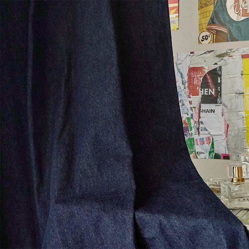 70~80年代のデニムの、個の美学。このデニムカーテンも同じく、バイオウォッシュ加工で引き出した均一ではないムラ感やアタリは、二つとして同じ表情を持たない。自然光や季節によっても表情を変え、時間と共に自分だけのものになっていく。買った瞬間がゴールじゃない、擦れて色が落ちたその先にあなただけのこだわりの空間がある。