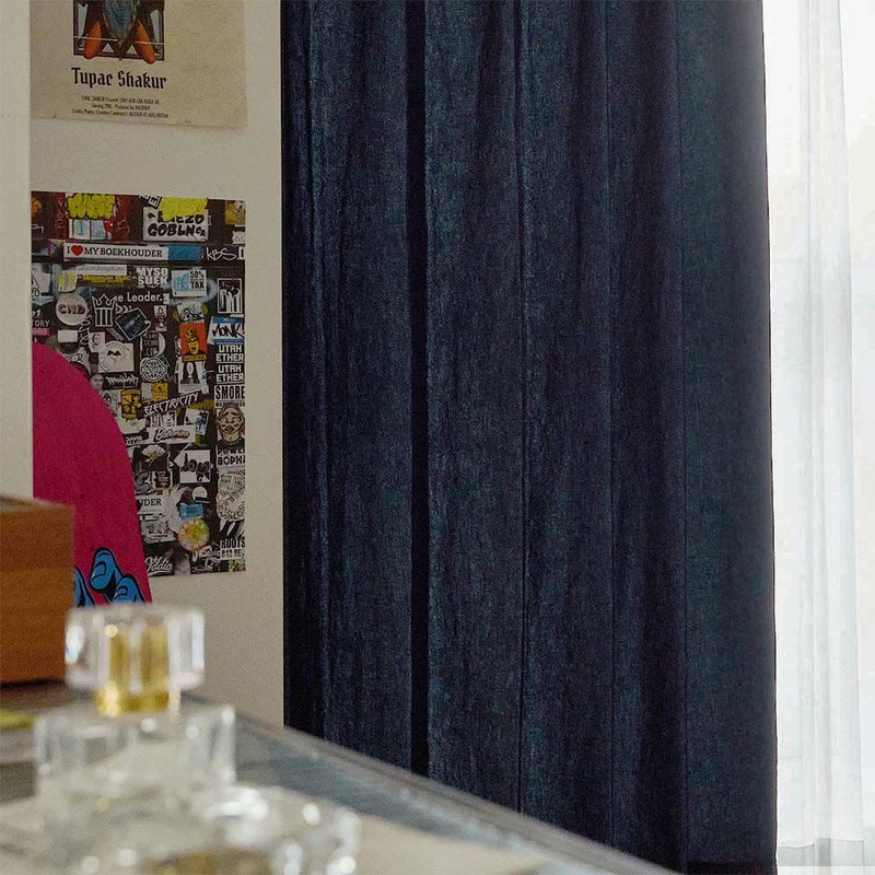 タフで重い12オンス、ムラのある縦落ち、色の抜け方すら一点もの。 着るたびに馴染み、時間とともに風合いが深まっていく。 そんな“育てる”感覚を、そのまま空間に落とし込んだのがこのデニムカーテンだ。 量産インテリアでは辿り着けない、「着るように飾る」新しい選択肢がここに。 -