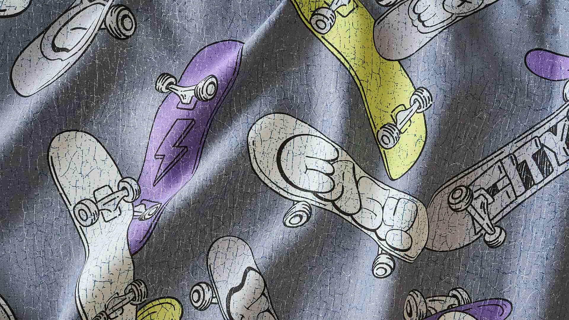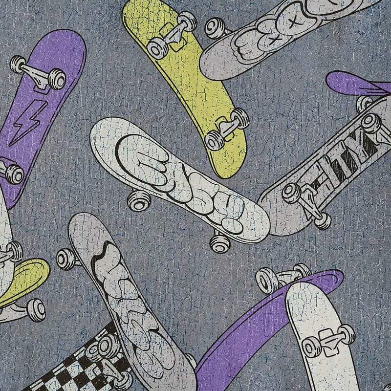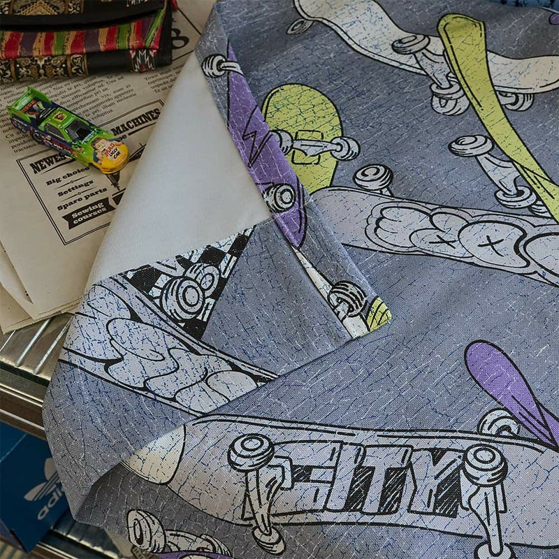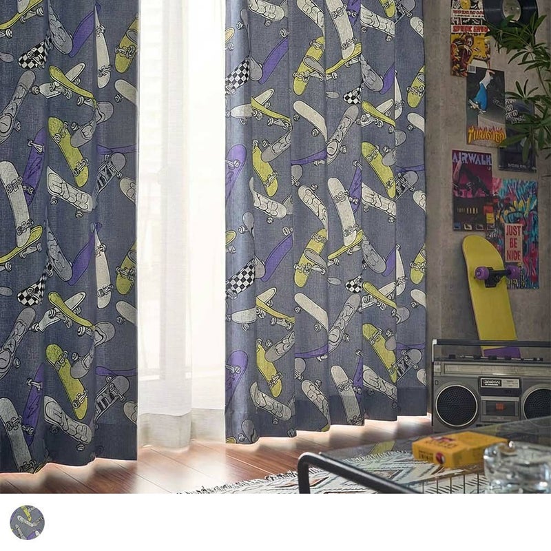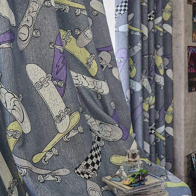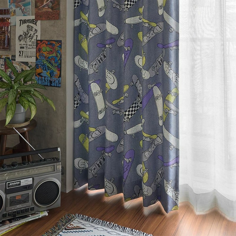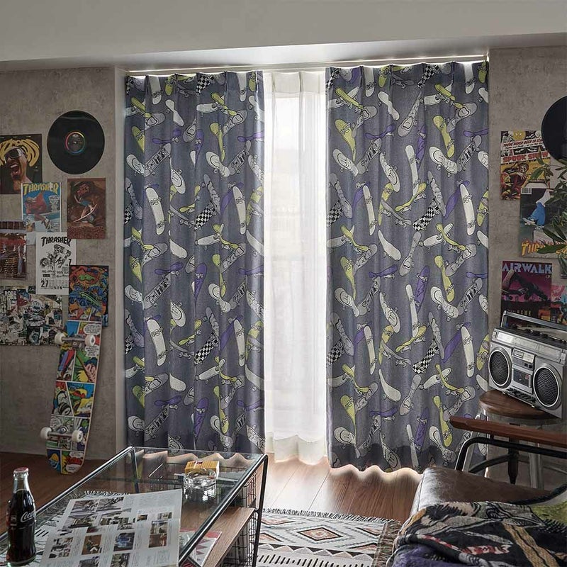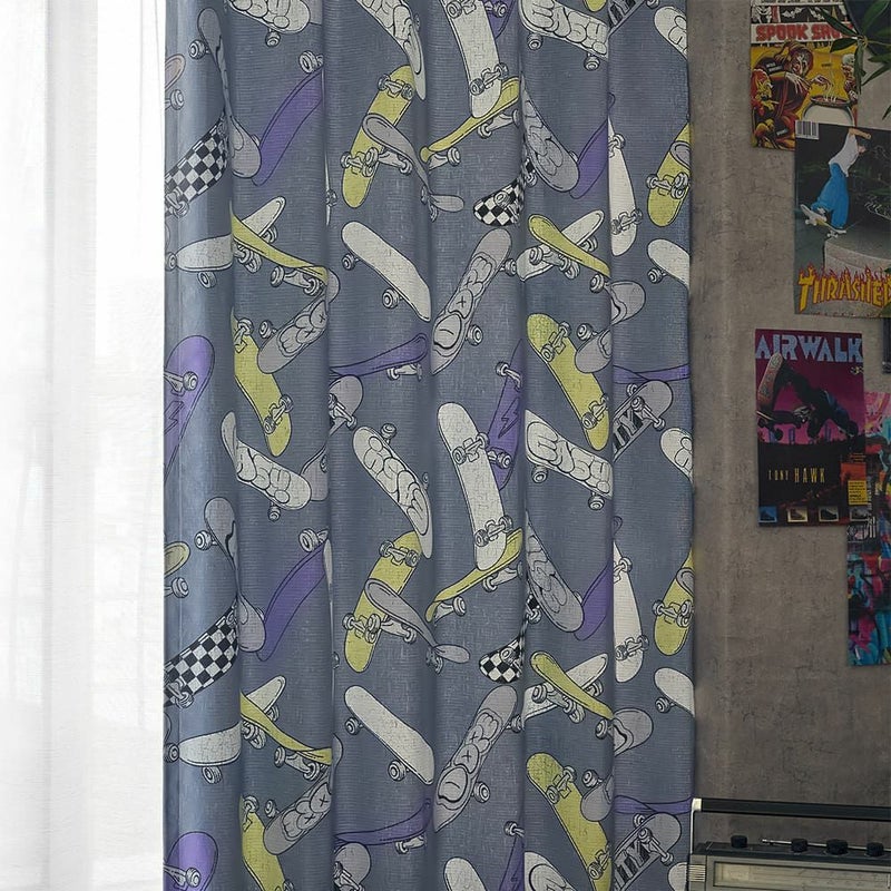グレーのキャンバスに、パープル、イエロー、ホワイトのスケートボードがリズムよく散るストリートテイストのカーテン。