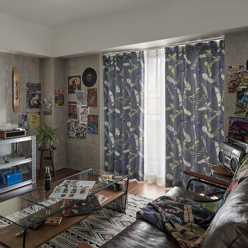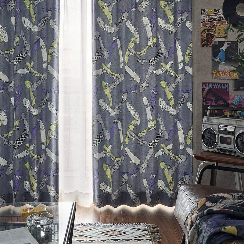 このスケート柄カーテンを取り入れることで、ストリートらしいリズムと奥行きが生まれる。