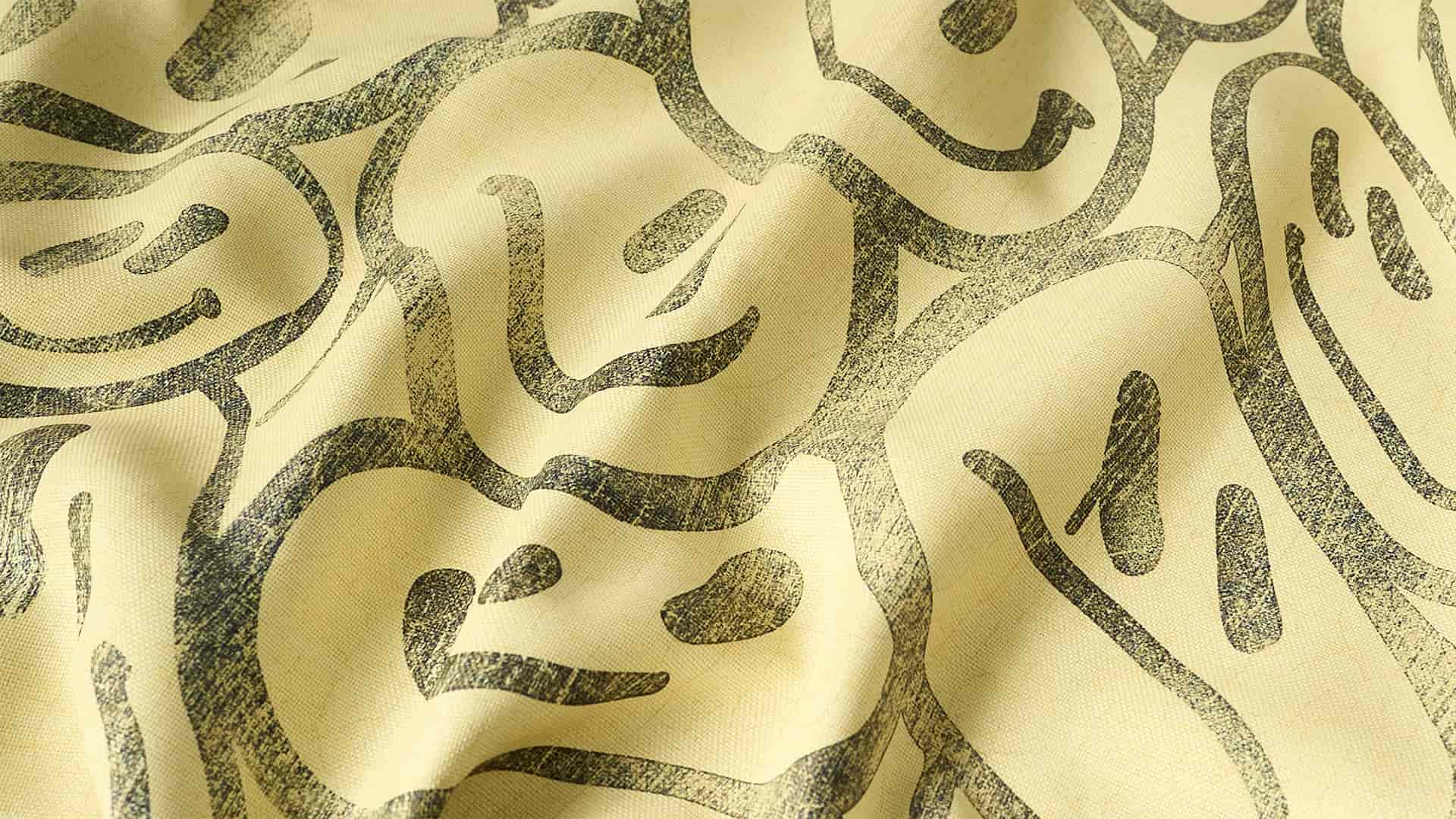 ラフに無造作に散らばる、スプレーで描いたようなスマイリーが、独自性抜群のカーテン。