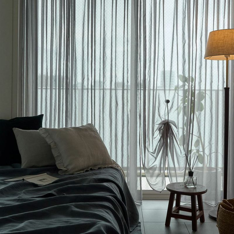 レース1枚でも、気になる外からの視線をやさしくカバー。 強い光を反射するミラーレースではありませんが、生地の表面がほどよく光を返すため、かけるだけで自然と見えにくくなります。