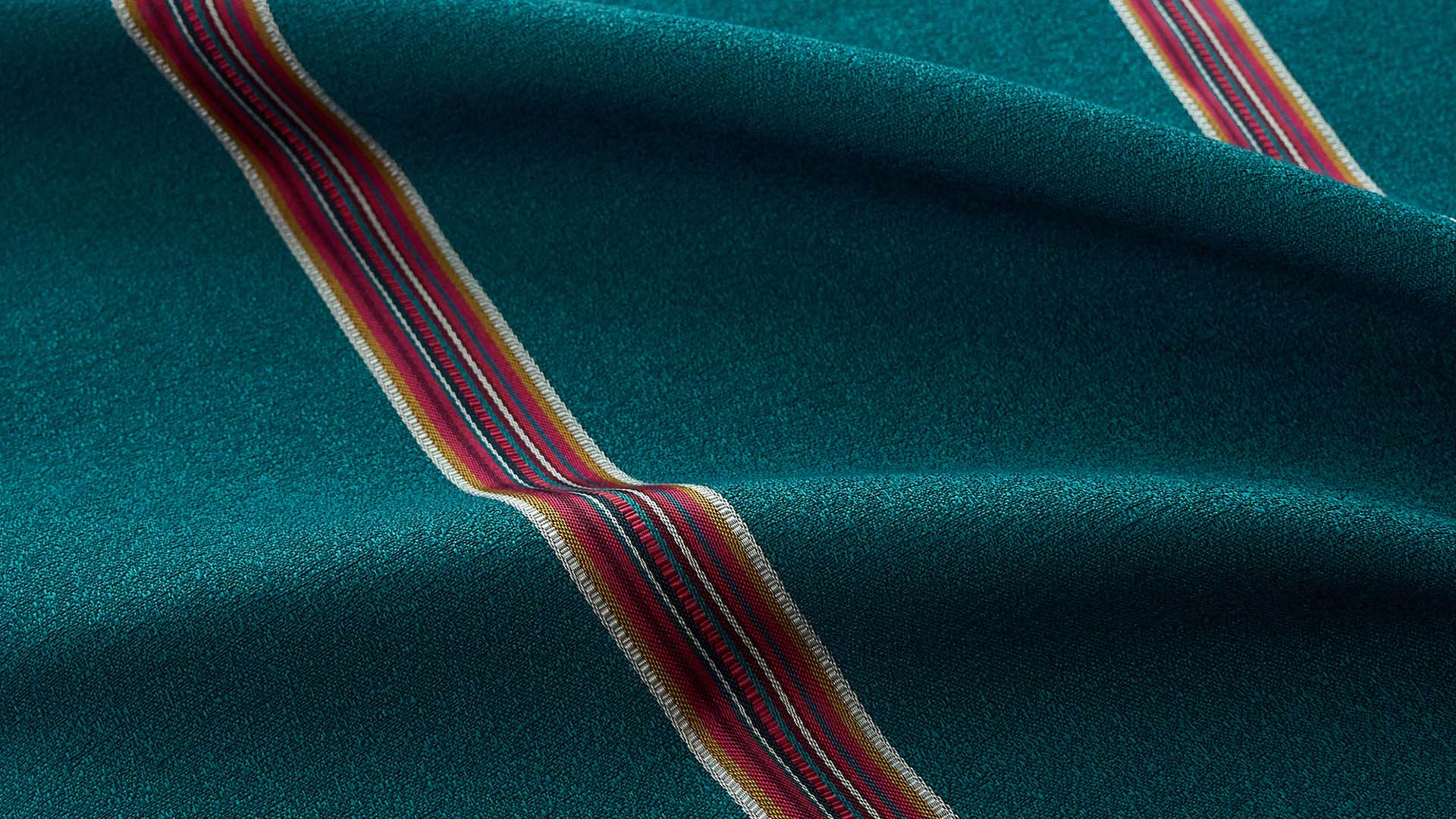 まるで1本のリボンをコラージュしたような贅沢なファブリック。ストライプは、光沢のあるカラフルな糸を組み合わせ、凹凸のある変わり織りで表現しています。 独特な織り地と絶妙な配色が、個性派のお洒落心をくすぐります。