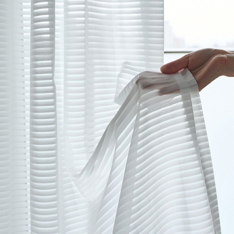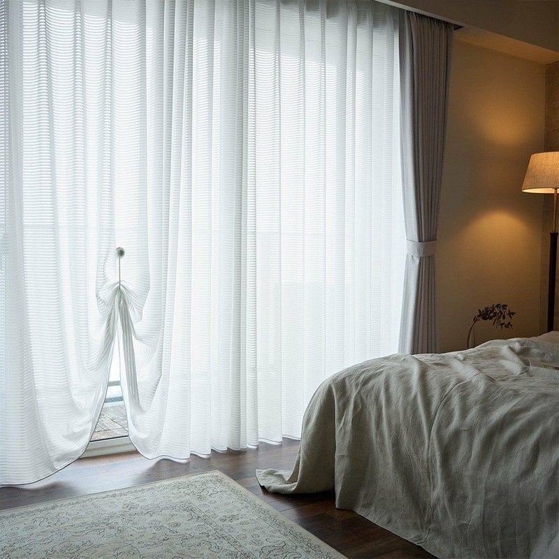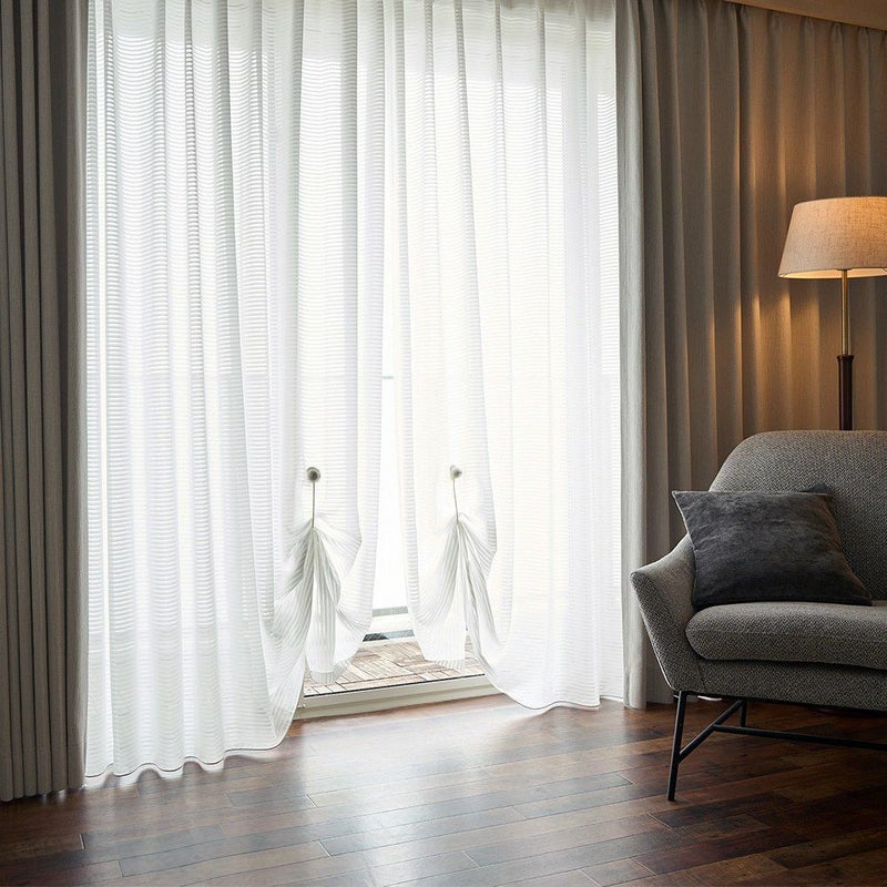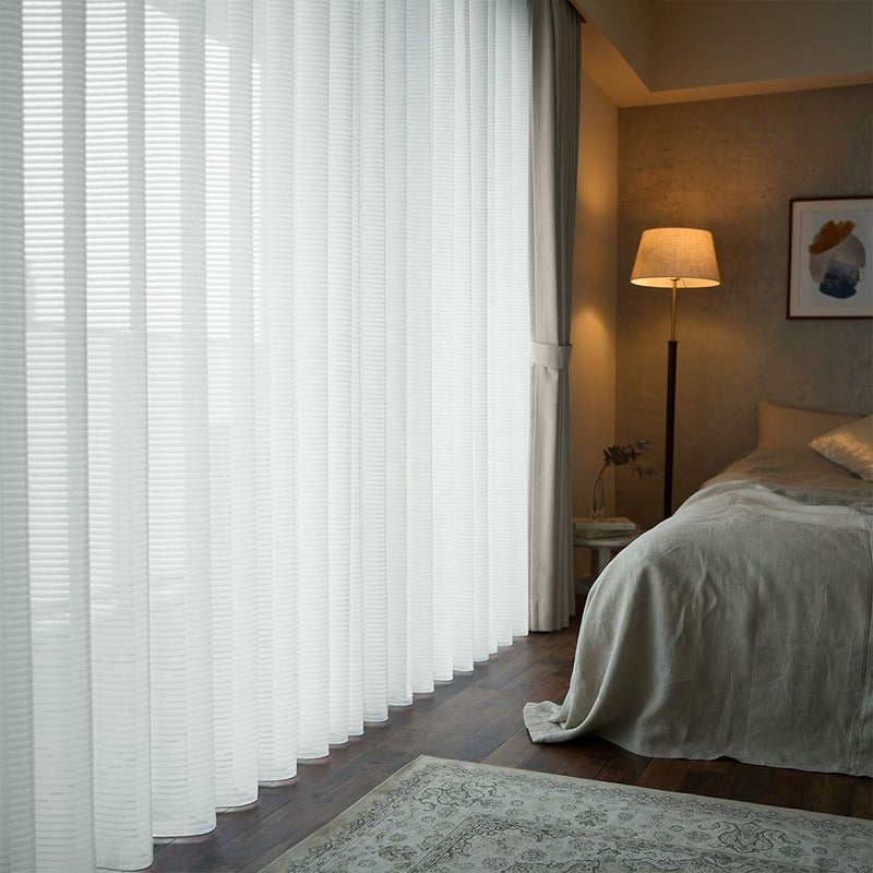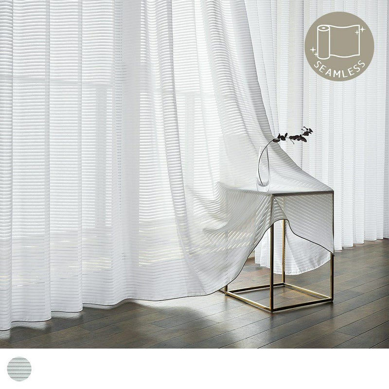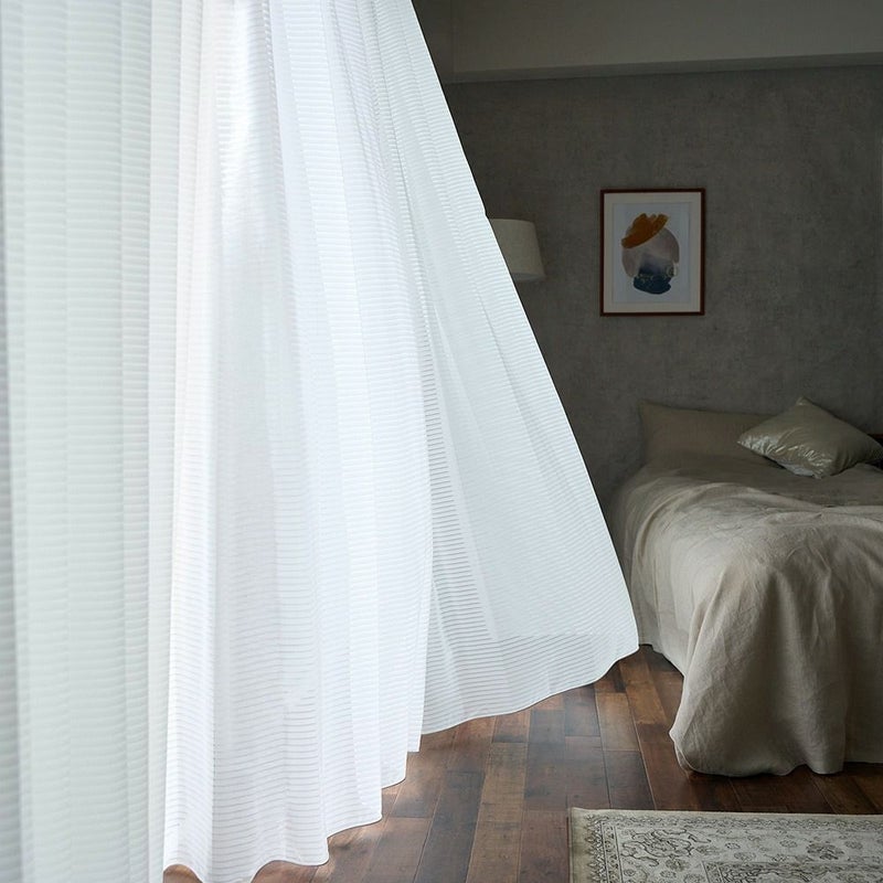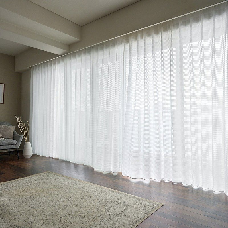 上品な透け感とさりげないボーダーラインが魅力の、シームレスレースカーテン。継ぎ目がない一枚仕立てだからこそ叶う、美しい仕上がりと開放感。お部屋を広く見せ、洗練された上質空間を演出します。
