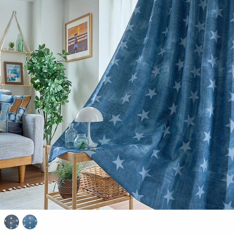 【撮影コーディネート】 レースカーテン <ジャズネップ ホワイト>西海岸で美しい星空を鑑賞することができる場所、ナチュラルブリッジの夜空のような深いブルーや、星のきらめきを思わせるデザインが特徴のデニム調カーテン、「デニムスター」。遊び心のあるデザインは、部屋にリラックス感と星空を見上げるような心地よさを演出します。