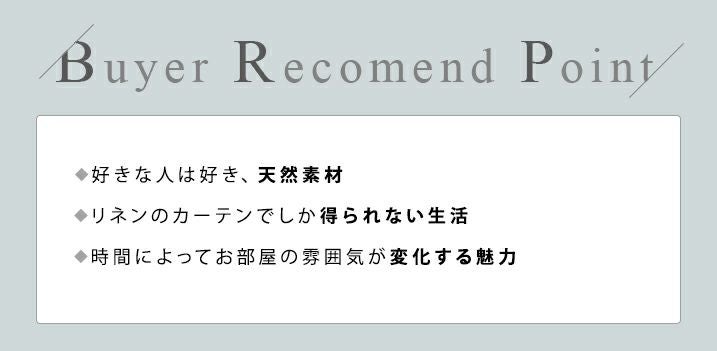 天然素材を愛する理由は、この優しい温もりがあるから。 吸湿性や通気性に優れているので、お部屋はいつも快適。リネン素材のカーテンにしか出せない柔らかいグレーの色合いから、温かみを感じていただけます。 -