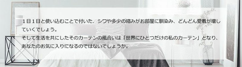 1日1日と使い込むことでついたシワや多少の縮みがお部屋に馴染み、どんどん愛着が増していくでしょう。そして生活を共にしたそのカーテンの風合いは「世界にひとつだけの私のカーテン」となり、きっとあなたのお気に入りとなるでしょう。 -