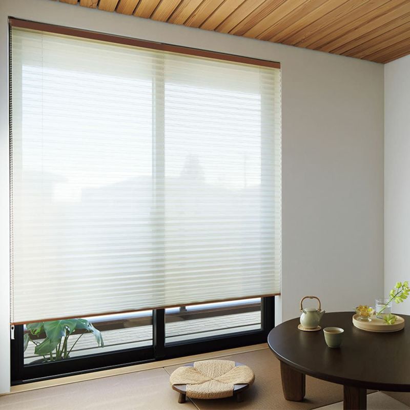 採光に便利な、薄手のシースルー生地。プリーツから溢れる、独特の柔らかな光をお楽しみいただけます。和紙調の素材感は、畳との相性も抜群です。