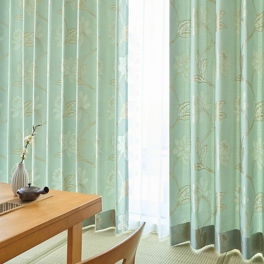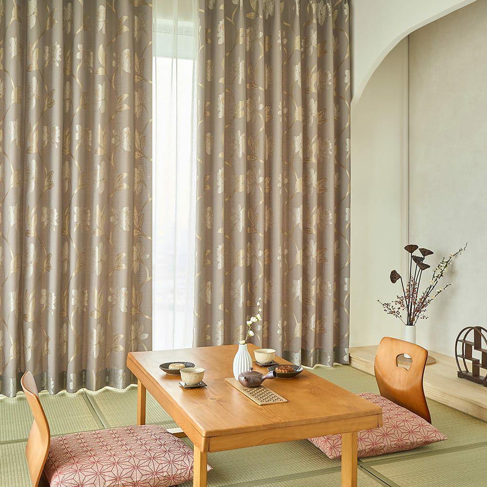 和室の役割は落ち着きとやすらぎ。そんな和室だからこそ、慣れ親しんだカーテンが合います。上品で優しい雰囲気漂うデザインが、伝統的な和室に一段階差をつけて、気品溢れる空間にいざないます。しなやかな枝から次々と咲いてゆく華模様。眩い植物の様子を描くジャガードカーテンで、上質で雅なひとときを。