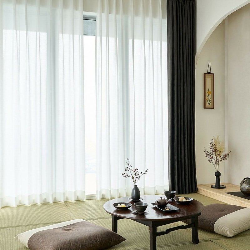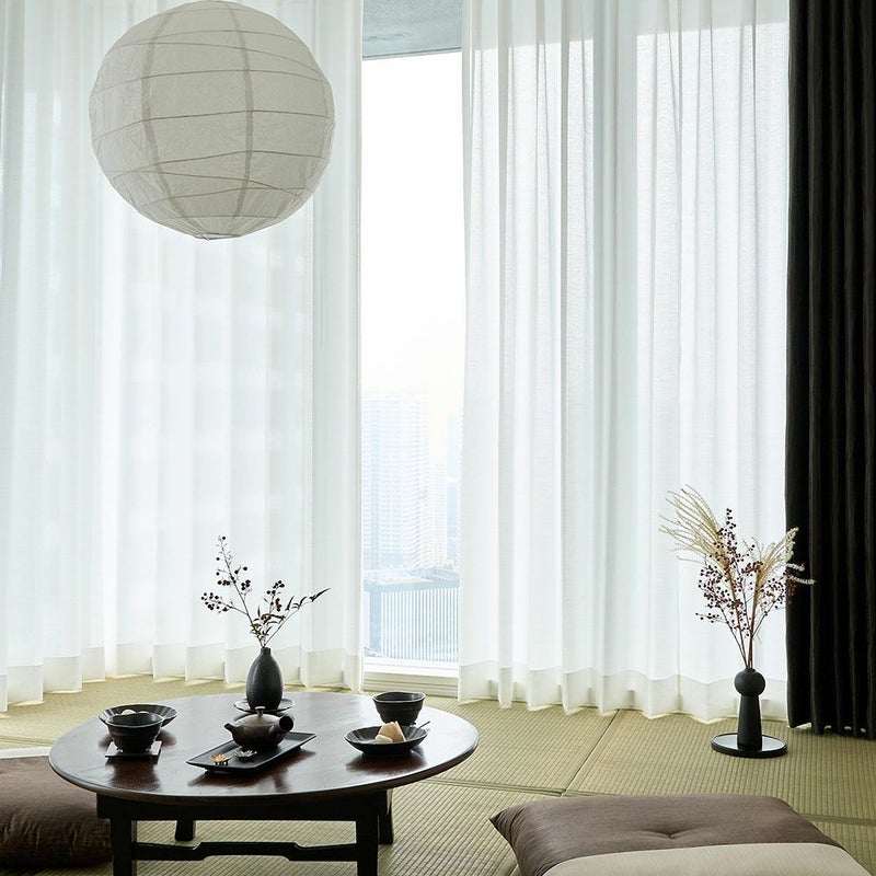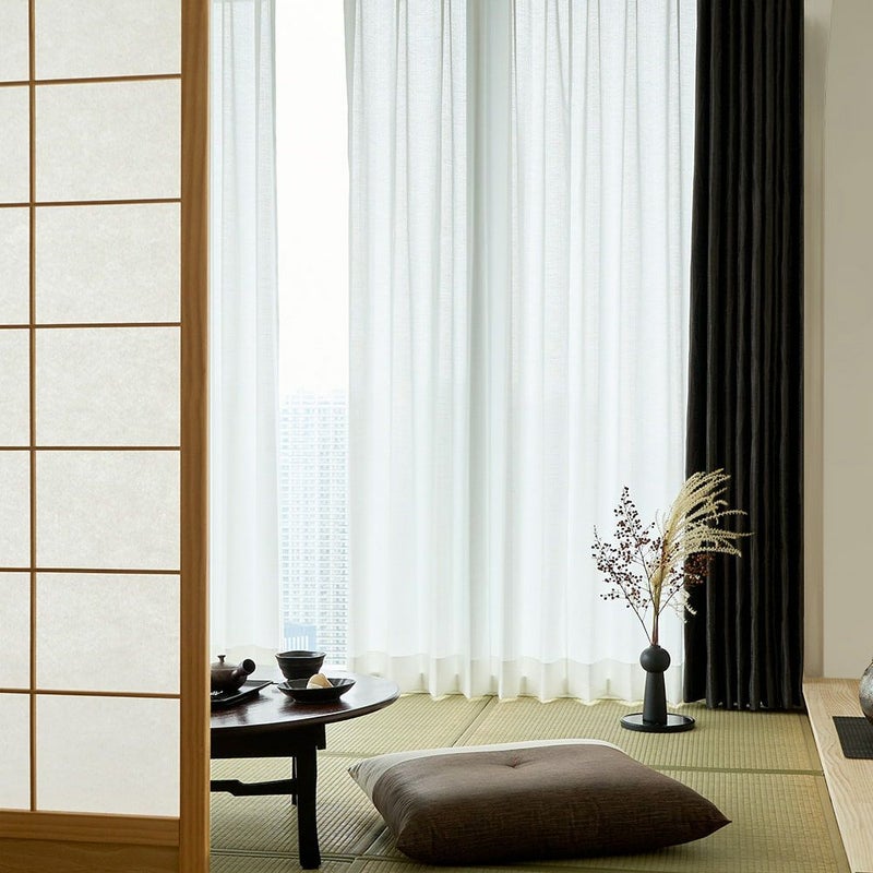 うすくて軽やかな風合いが障子紙のような繊細さを魅せる、遮像レースカーテン。薄手の生地にしっかりと遮像効果が備わっているので、障子のような感覚でお使いいただけます。相性のいい和室だからこそ、その魅力を感じることができるでしょう。