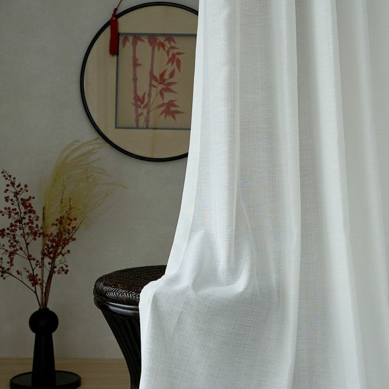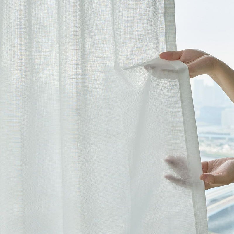 オーダーカーテンならではの、極細糸がぎゅっと織りなされ、障子紙のような素朴で優しい表情を生み出します。絶妙な薄さと軽さに対して、不思議と安心感を持てる丈夫な生地感です。