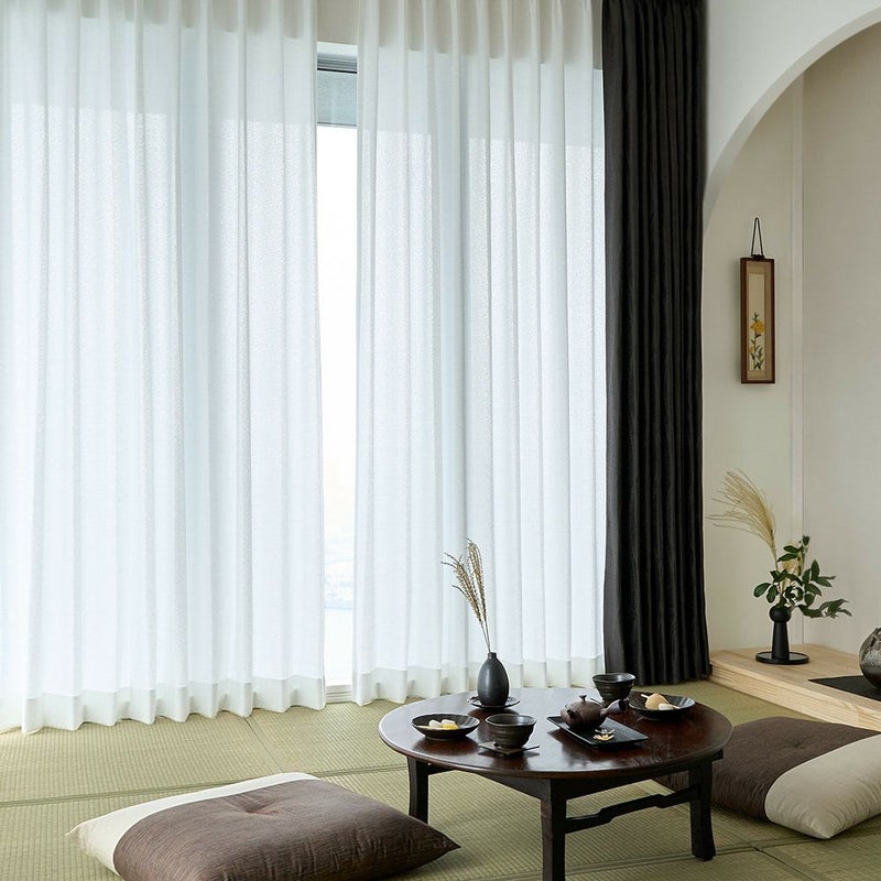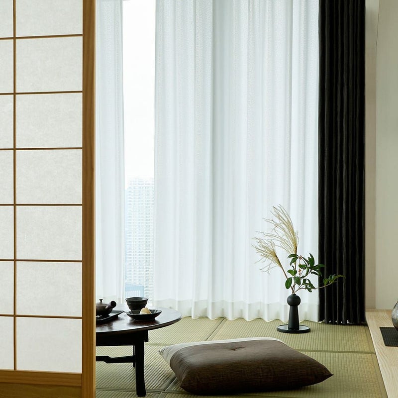 和室に相応しい漆喰風の遮像レースカーテン。機能がしっかりと備わった快適さも選ばれる理由のひとつです。レース越しの光がやわらかな窓辺で、人目を気にせずお茶を愉しむ。落ち着きある贅沢な時間が、今一度、和の心と美を伝えます。
