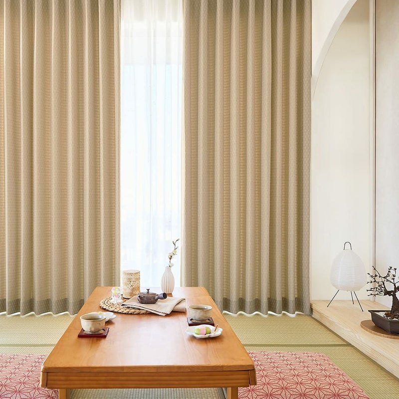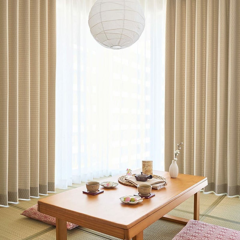 穏やかに晴れた空気感を演出するワケは、3級遮光機能に。ほどよく陽を遮り、柔らかい光を和室に取り込みます。 明るい色のカーテンだから、陽を遮るのに部屋が暗く感じないのも、生活しやすく嬉しいポイントです。