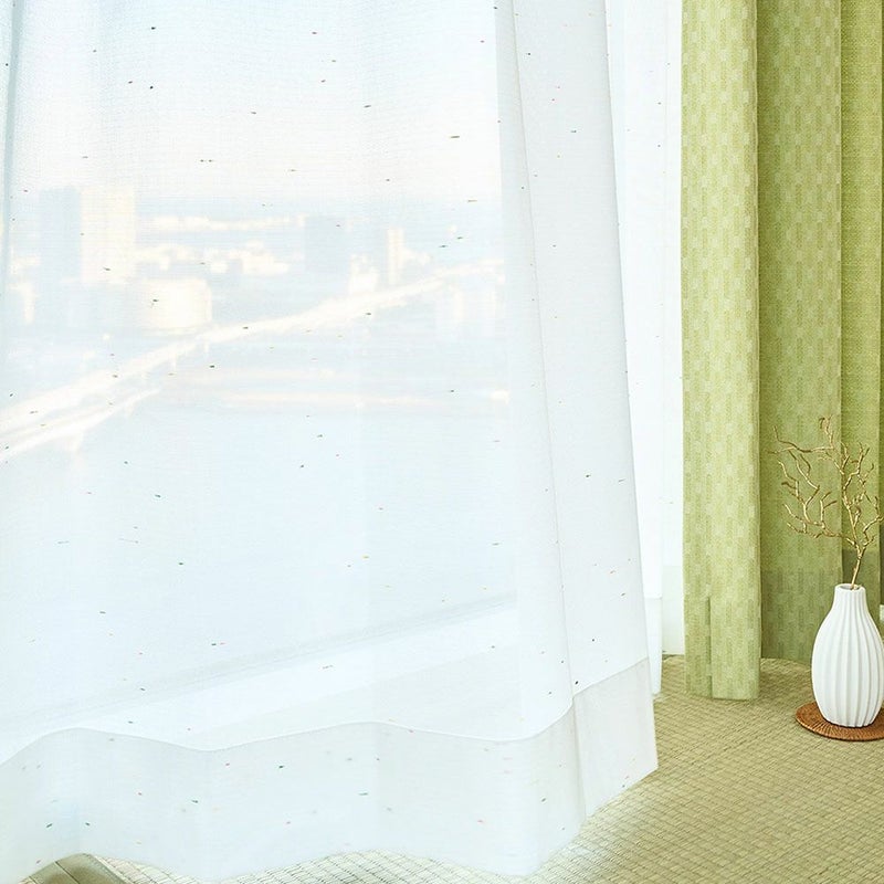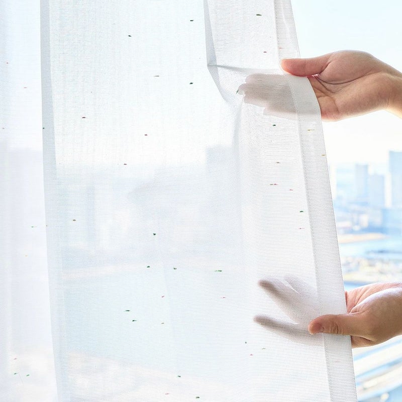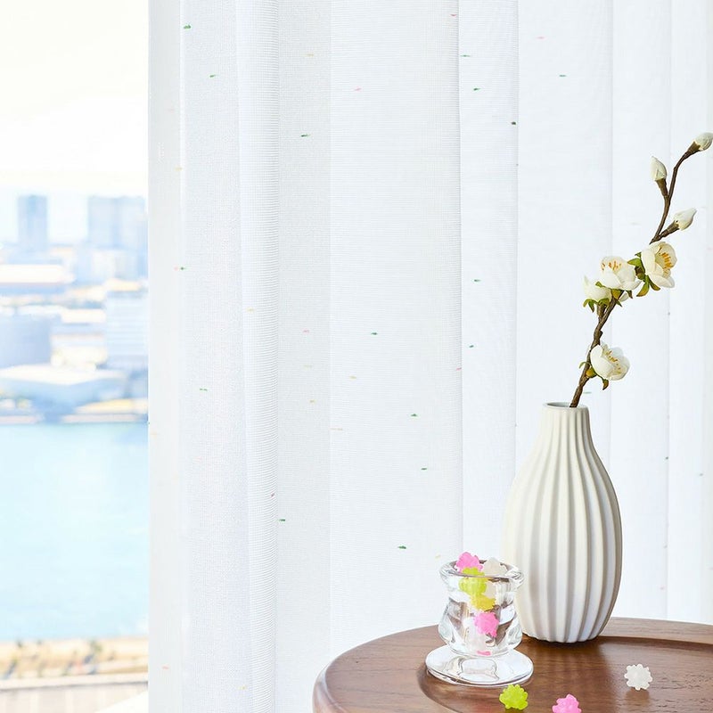 見た瞬間、その小さな彩りにときめく。色とりどりのネップ糸が可愛らしいレースカーテンです。ピンクに黄色、そして緑。まるで金平糖のような小さなときめきを編み込んだ生地。シンプルな見た目ながらも、さり気なく可愛らしさを潜めた姿を見る度に、ほっこりとします。