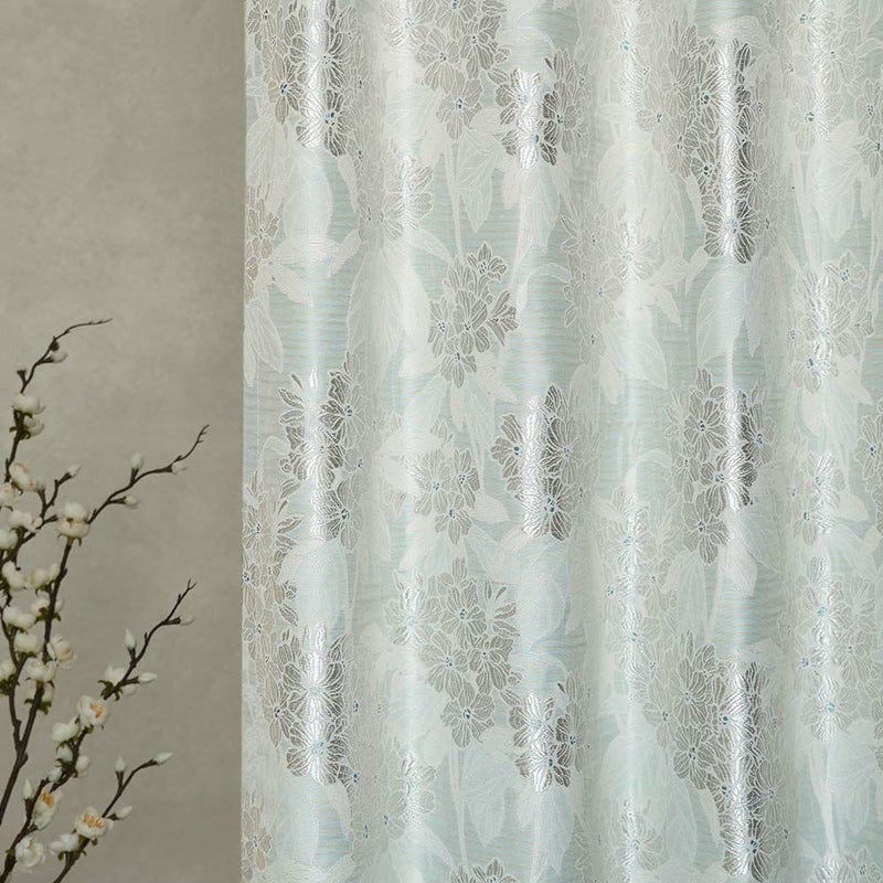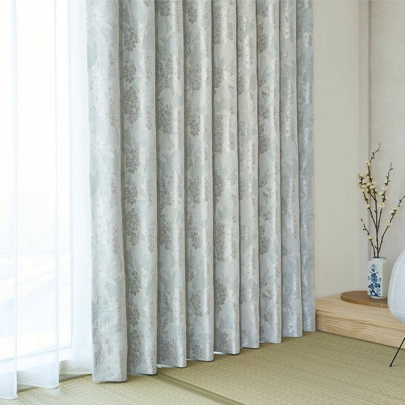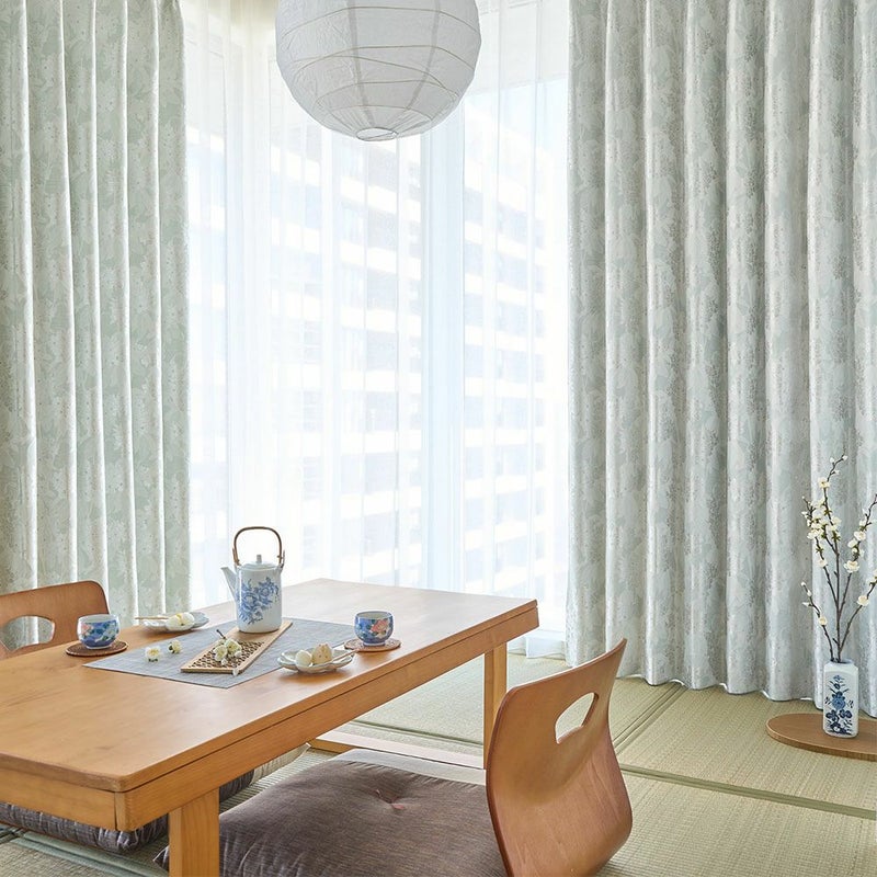和室に広がる、白銀の花模様。雅な着物を思わせる佇まいが美しい、極上のオーダーカーテンです。ほんのりと青みを魅せる清らかな白地に、白銀の花模様が優美に煌めきます。まるで訪問着のように上質で空間を洗練させるデザイン。格式高い和室でも見劣りすることなく、雅やかな印象に際立たせるでしょう。