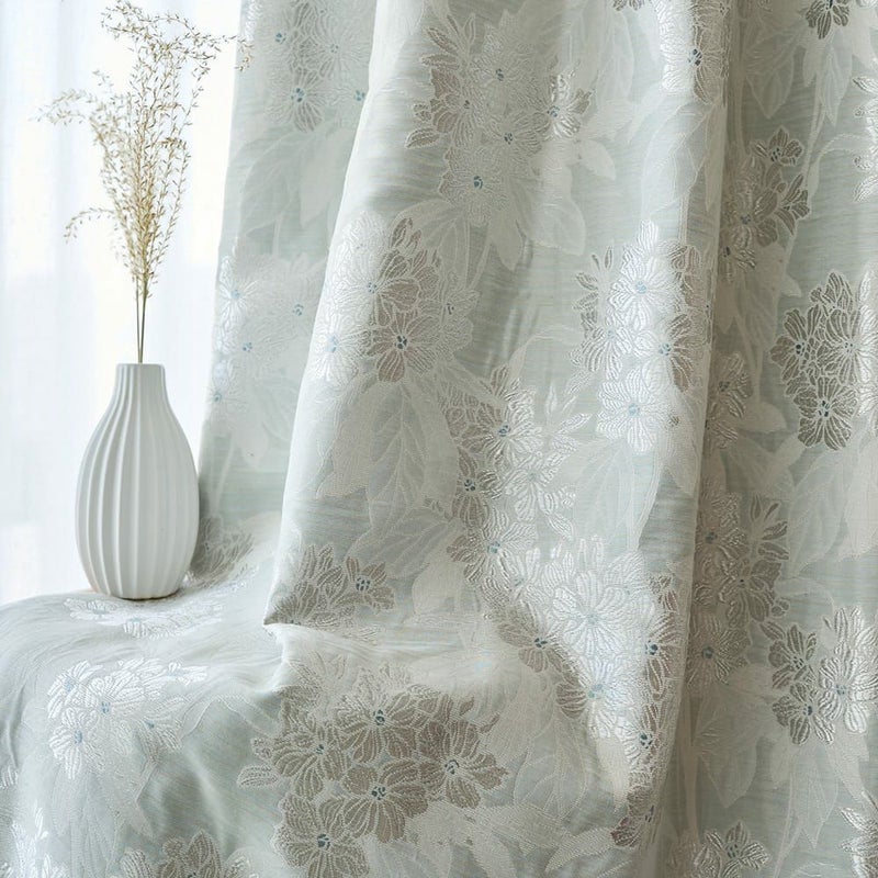 澄んだ白銀に、美しく輝き咲く花模様のオーダーカーテン。訪問着を思わせる優美なデザインが、和室に洗練された雅な品格を装います。麗しく咲き誇る花模様が窓辺を飾り、極上の和空間に。優雅な寛ぎを味わう、特別な日々をお過ごし頂けますように。