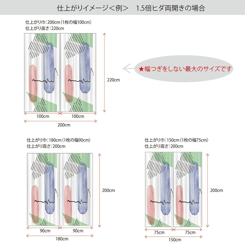 ※1.5倍ヒダで1枚あたり横幅が90~100cmまでであれば、多くのカーテンが生地1巾(巾継ぎなし)で縫製されます。