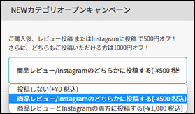商品レビュー/Instagramのどちらかに投稿するを選択すると500円割引が適応されます。