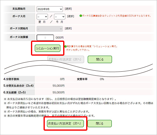 ショッピングローンお申込み画面から、「支払いシミュレーション」 することが可能です。ご希望のお支払い回数をお選び頂き、「お支払方法決定」を押します。