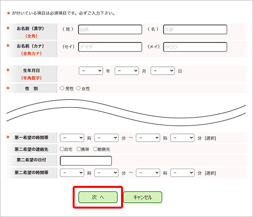 お名前、お住まい、ご連絡先などの基本的な個人情報のご記入を