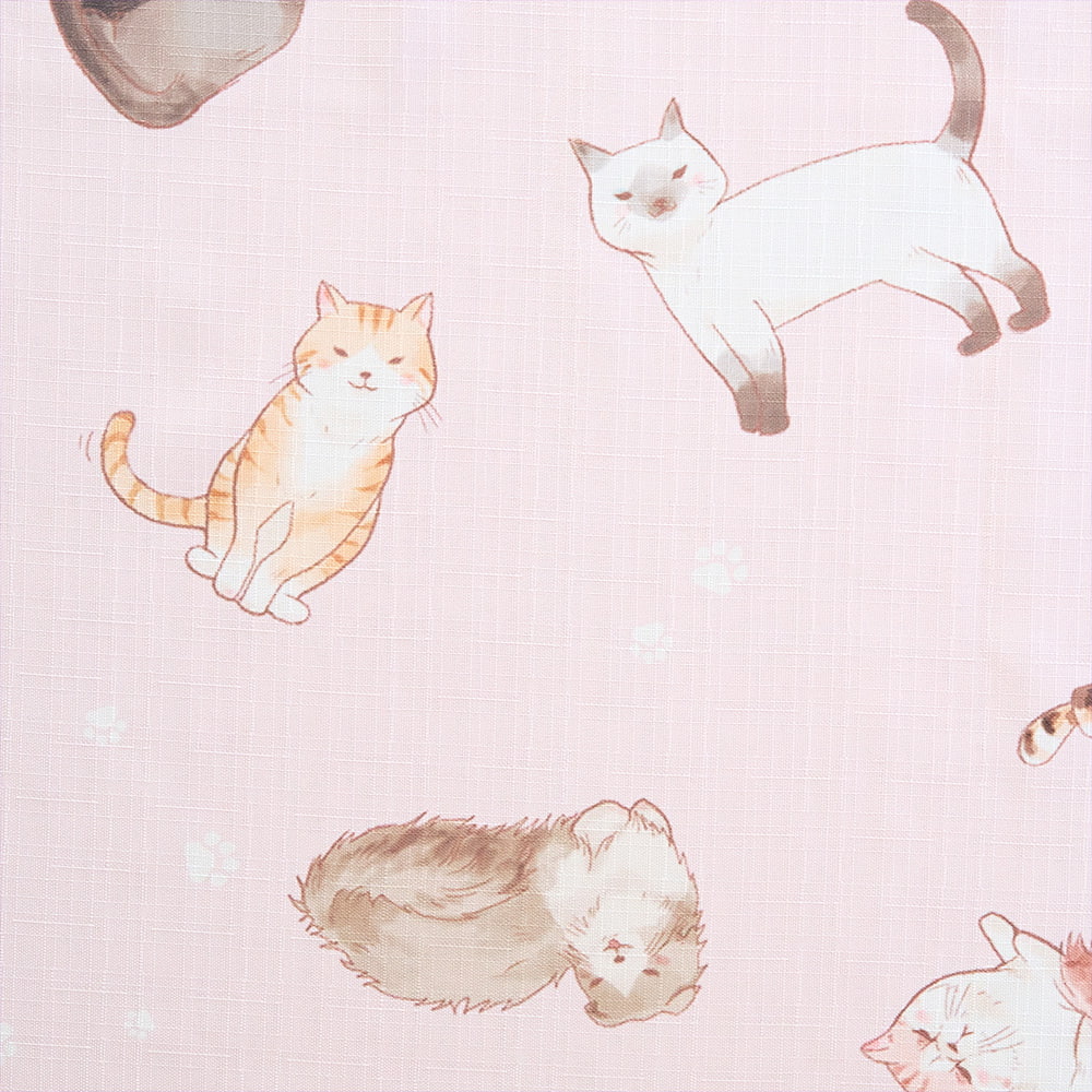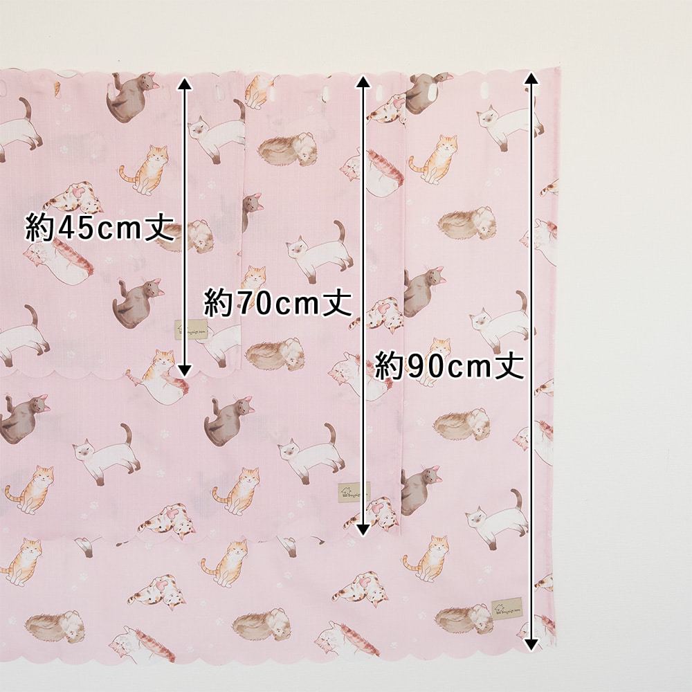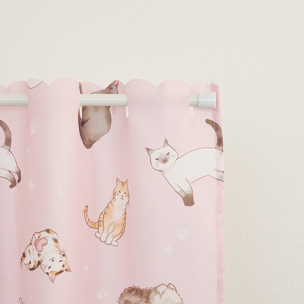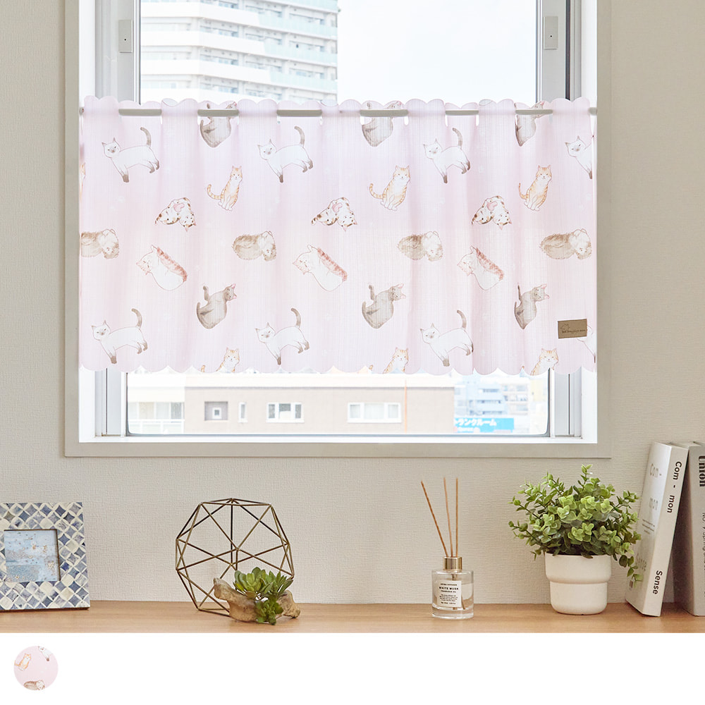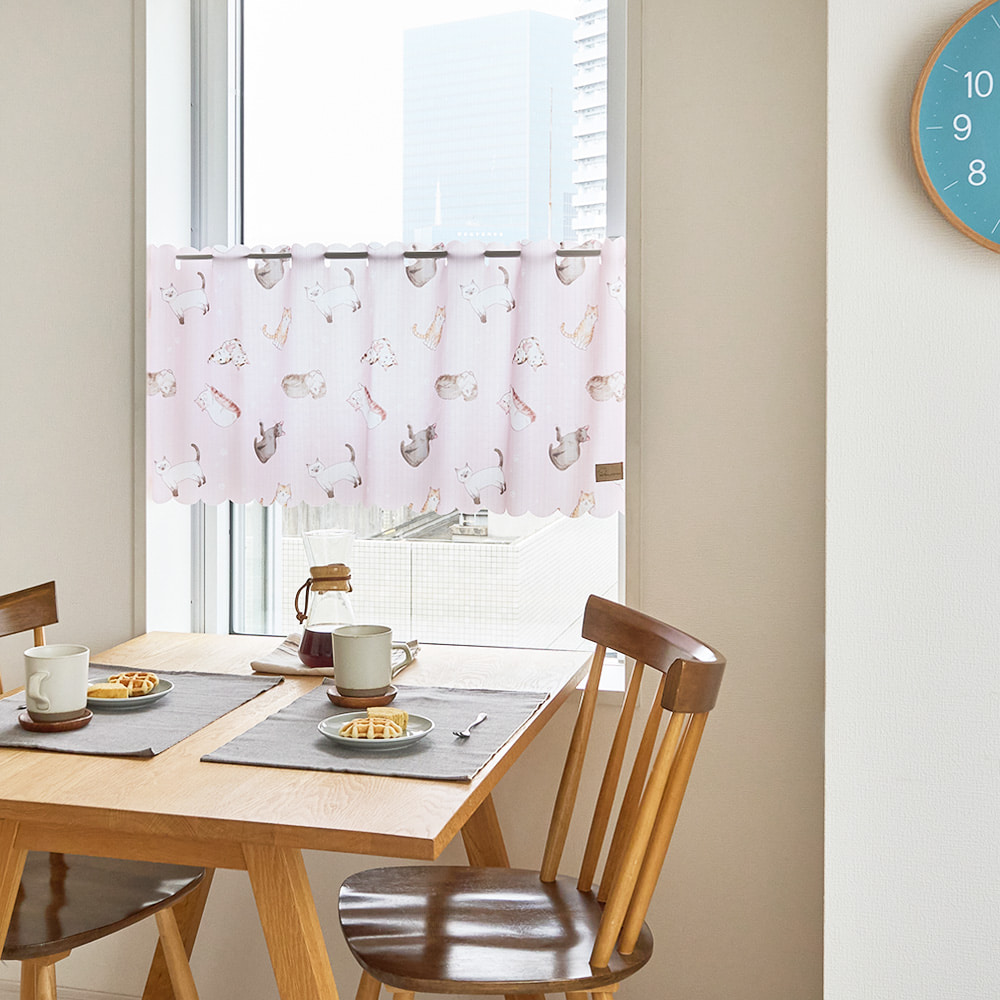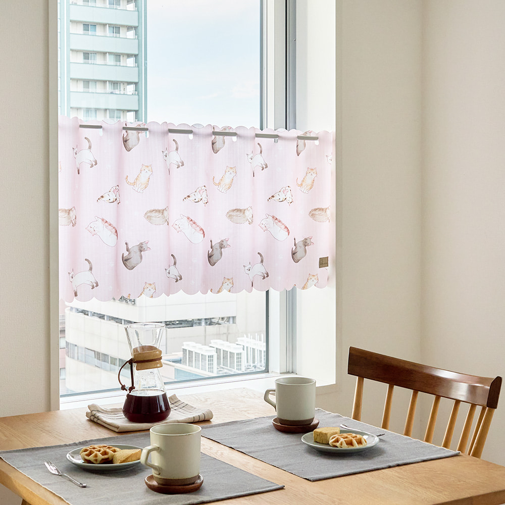愛らしい猫たちがいっぱいの、見ているだけで癒やされるカフェカーテンです。