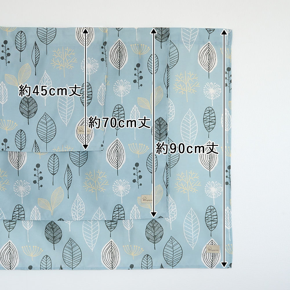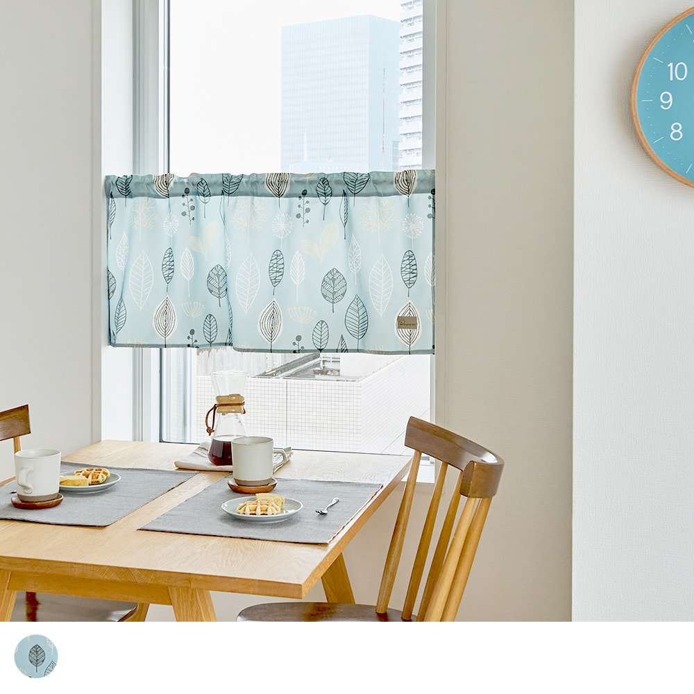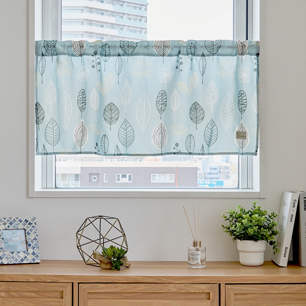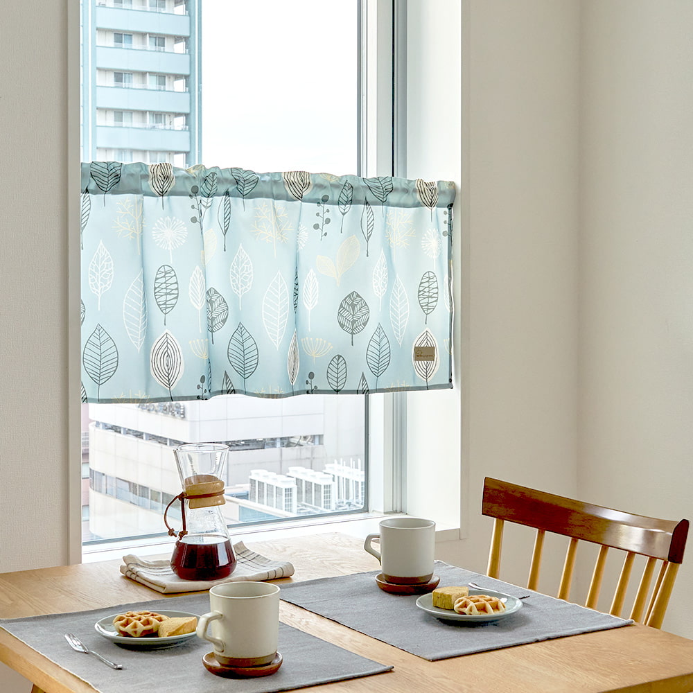 ナチュラルなリーフ模様が優しく揺れ、窓辺にさわやかな風を運んでくれる北欧テイストのカフェカーテンです。