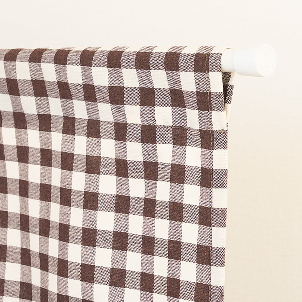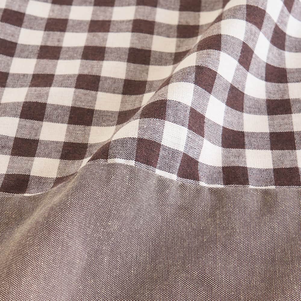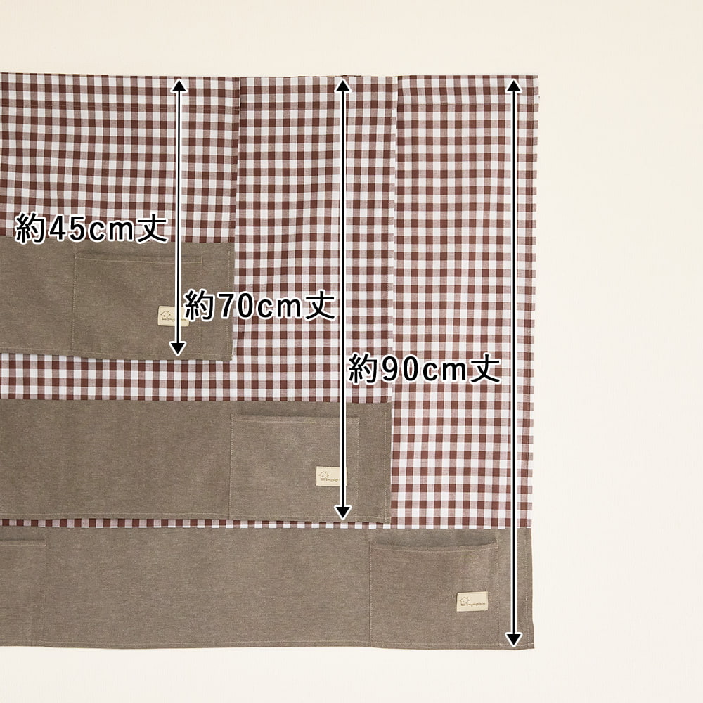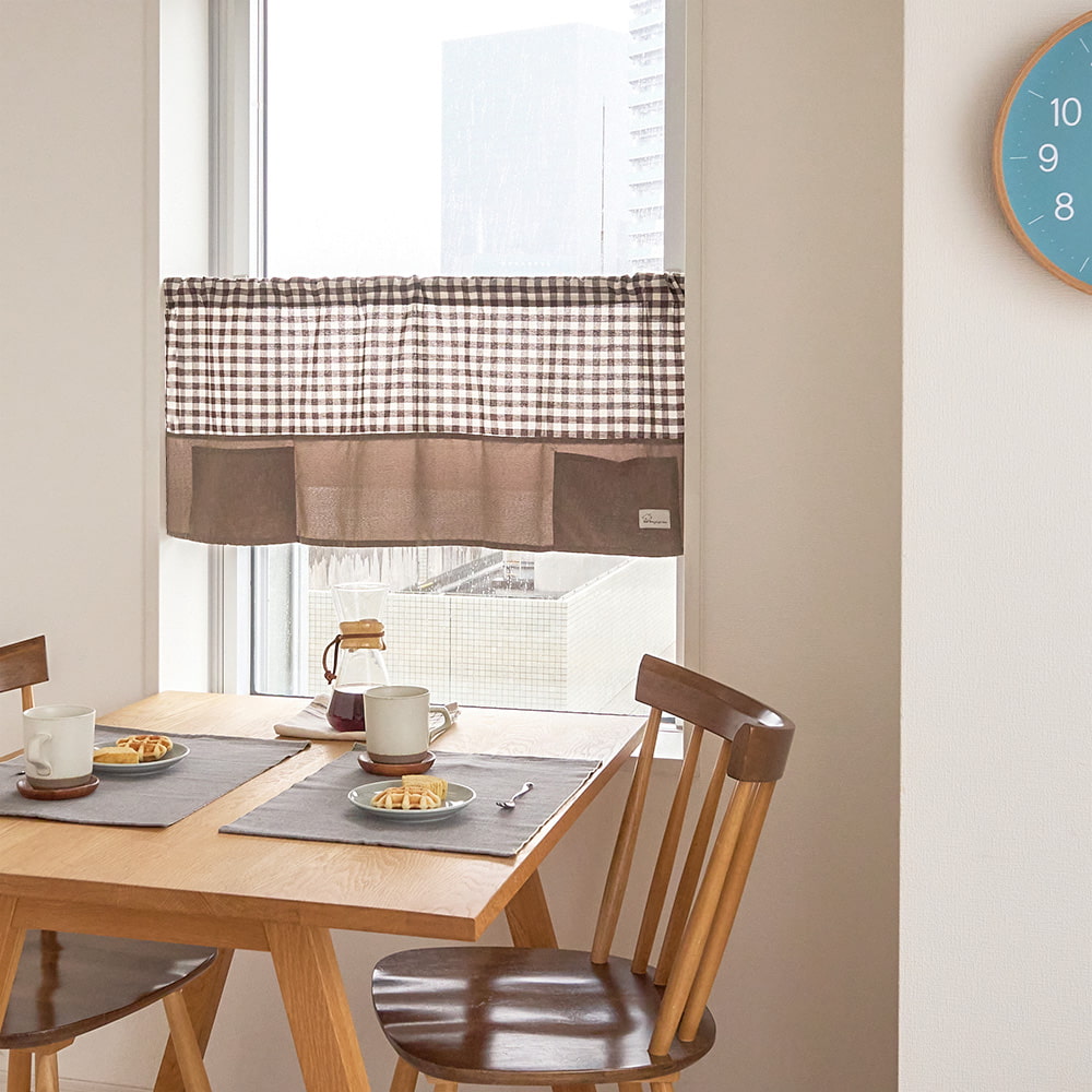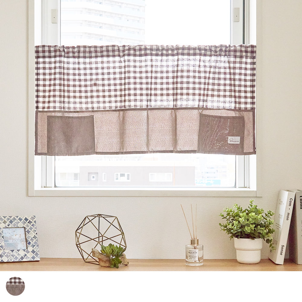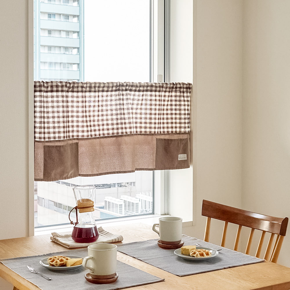 チェック柄×無地の切り替えデザインが可愛い、ポケット付きカフェカーテン。