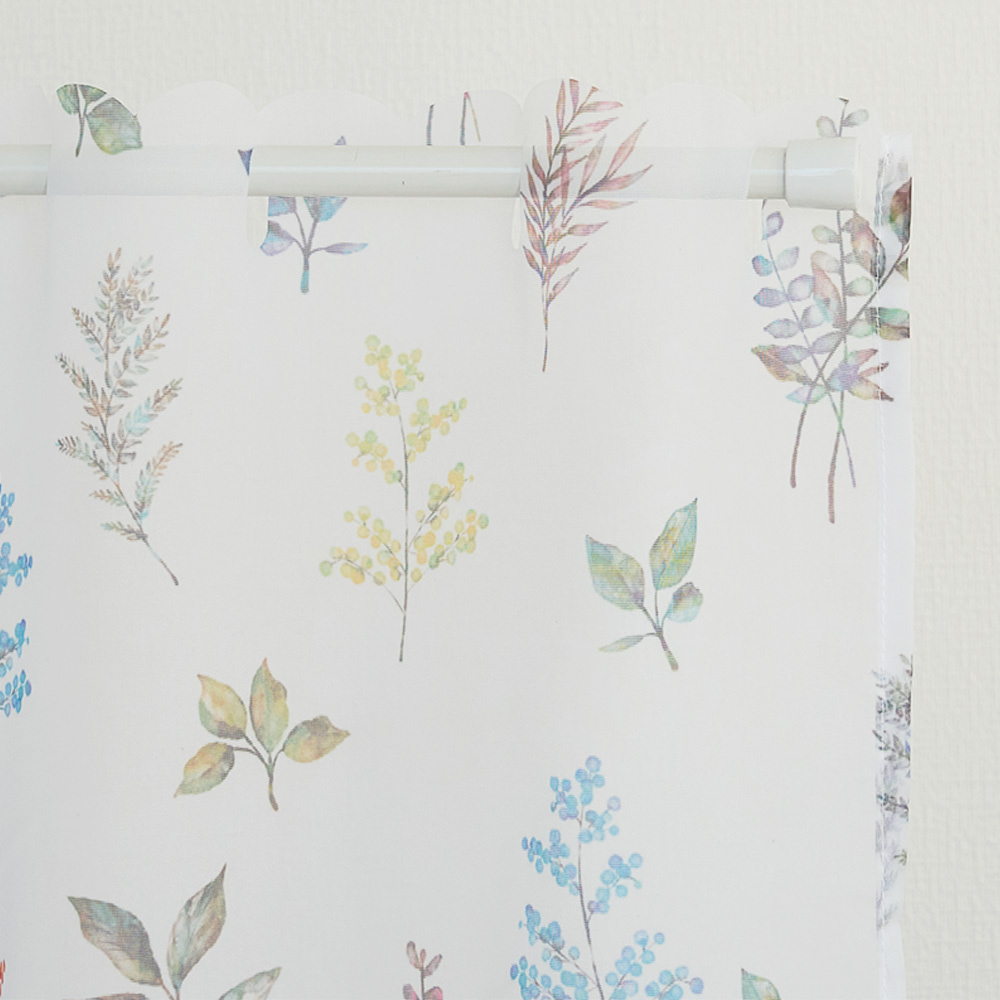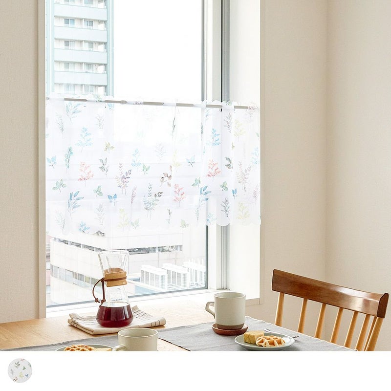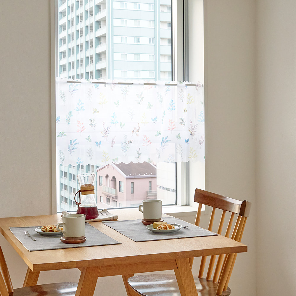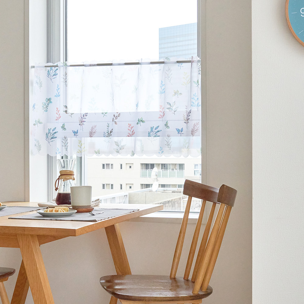 軽やかなレースに、水彩タッチの葉柄をちりばめた爽やかなカフェカーテン。