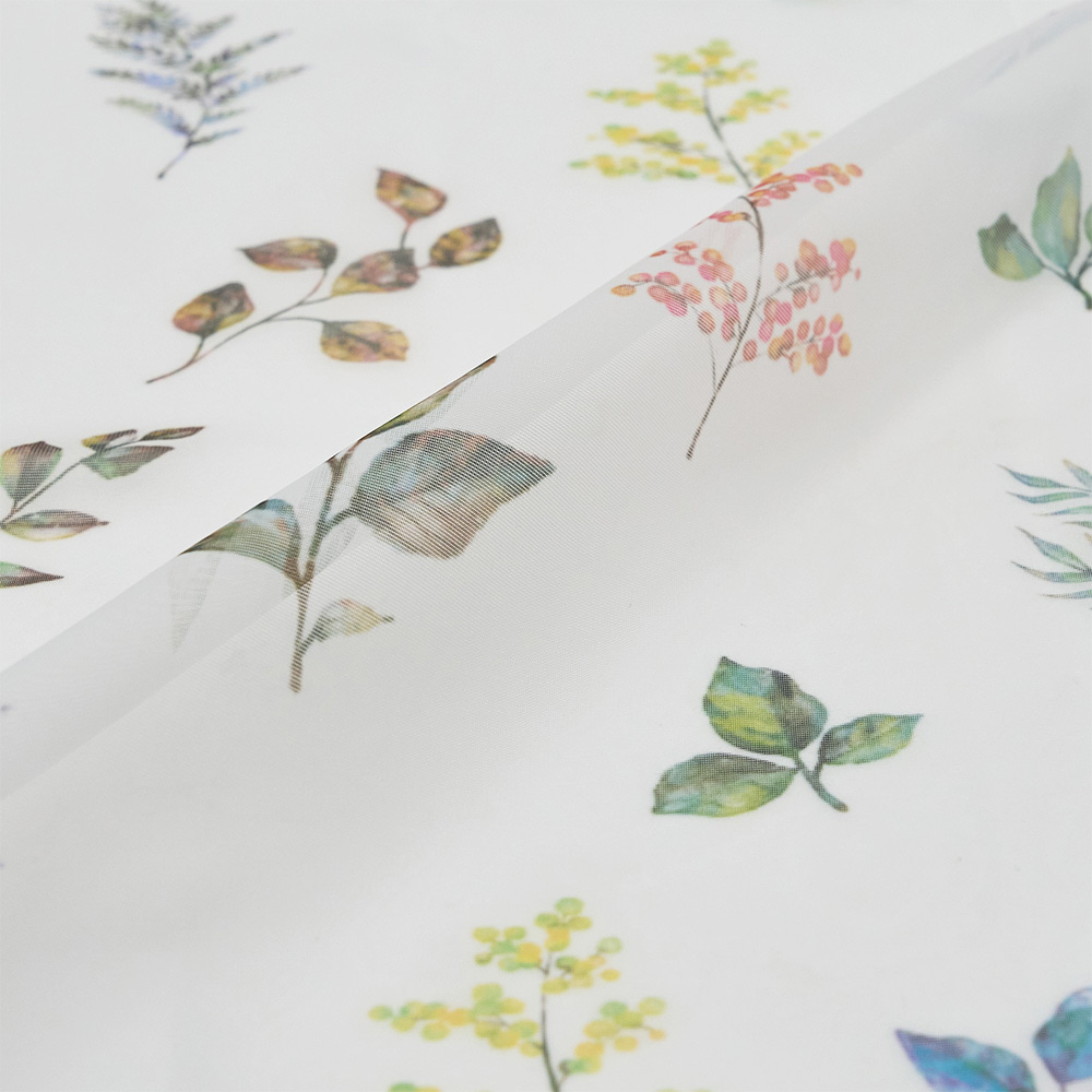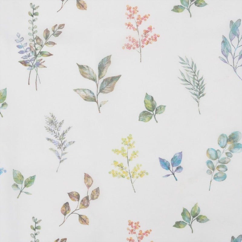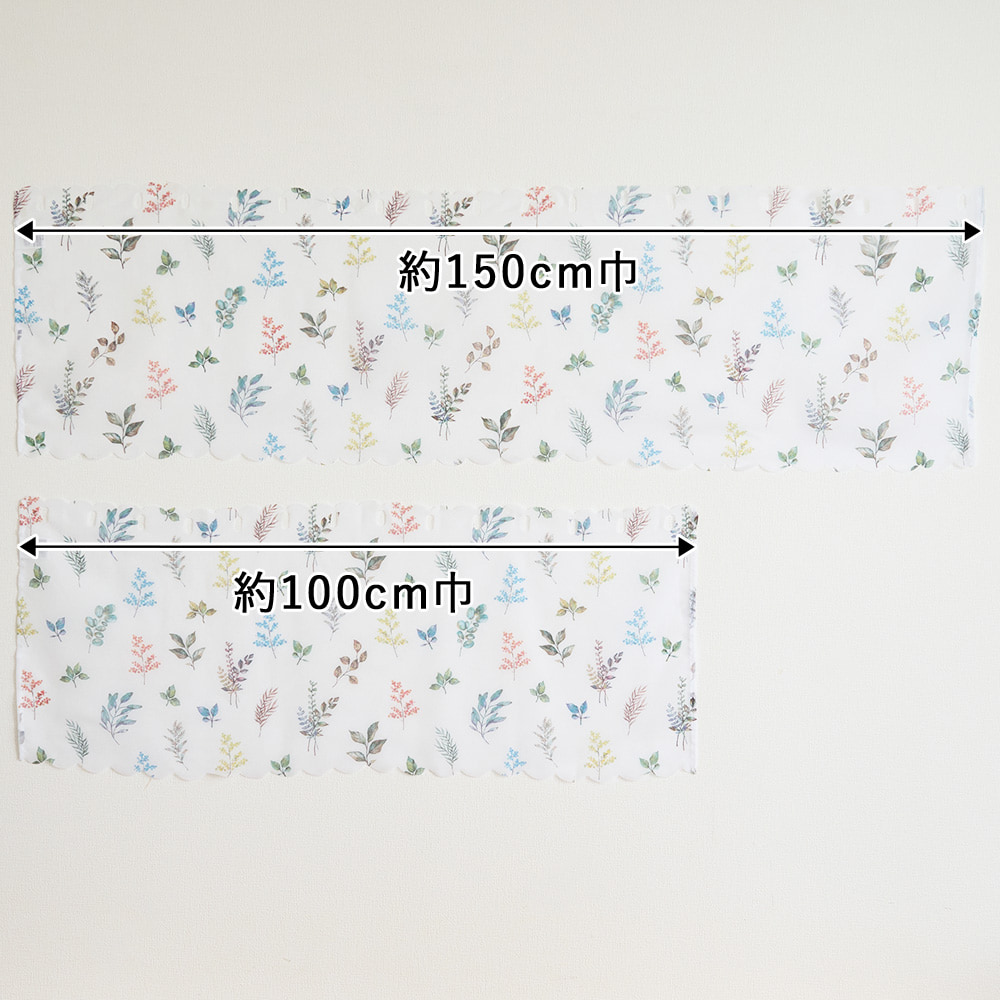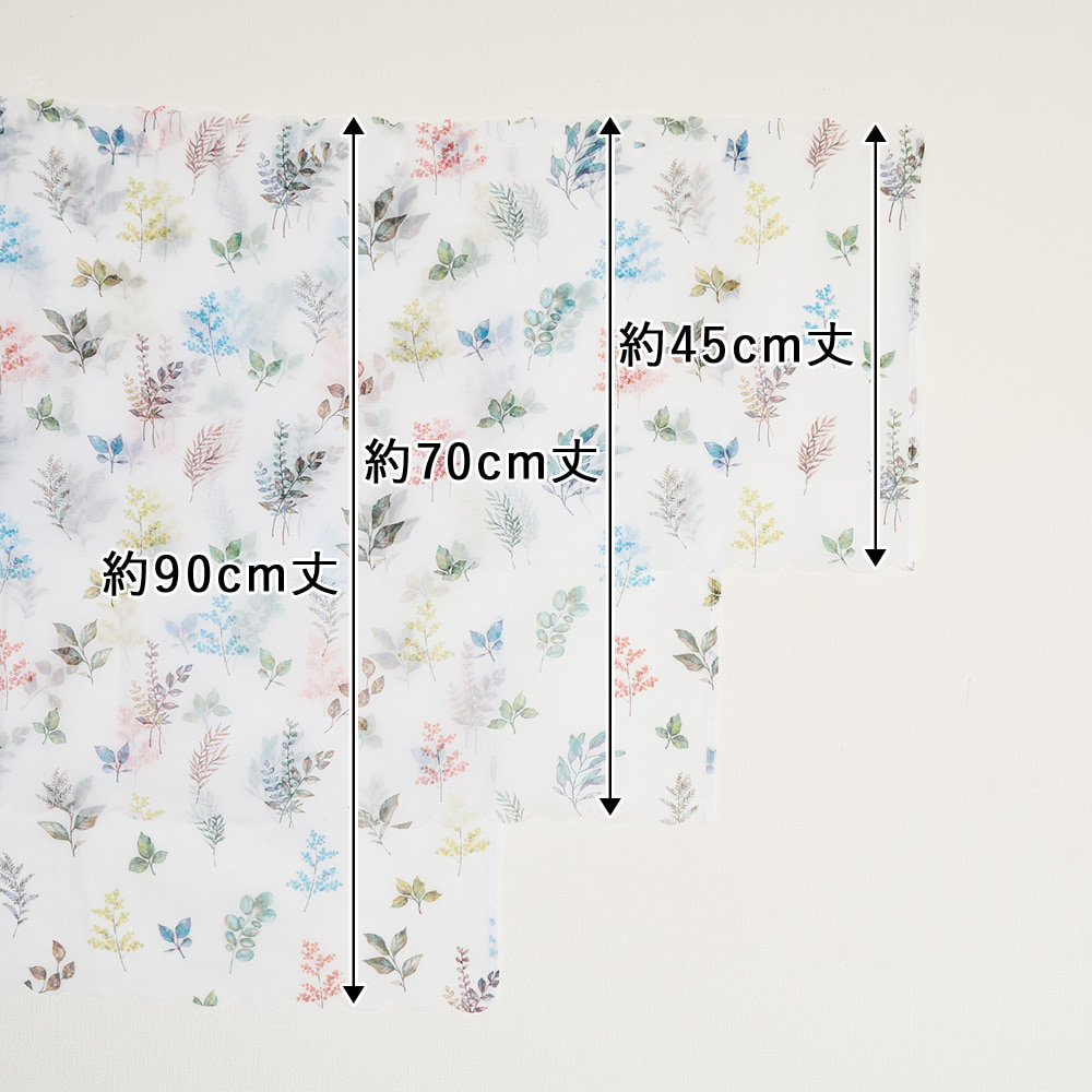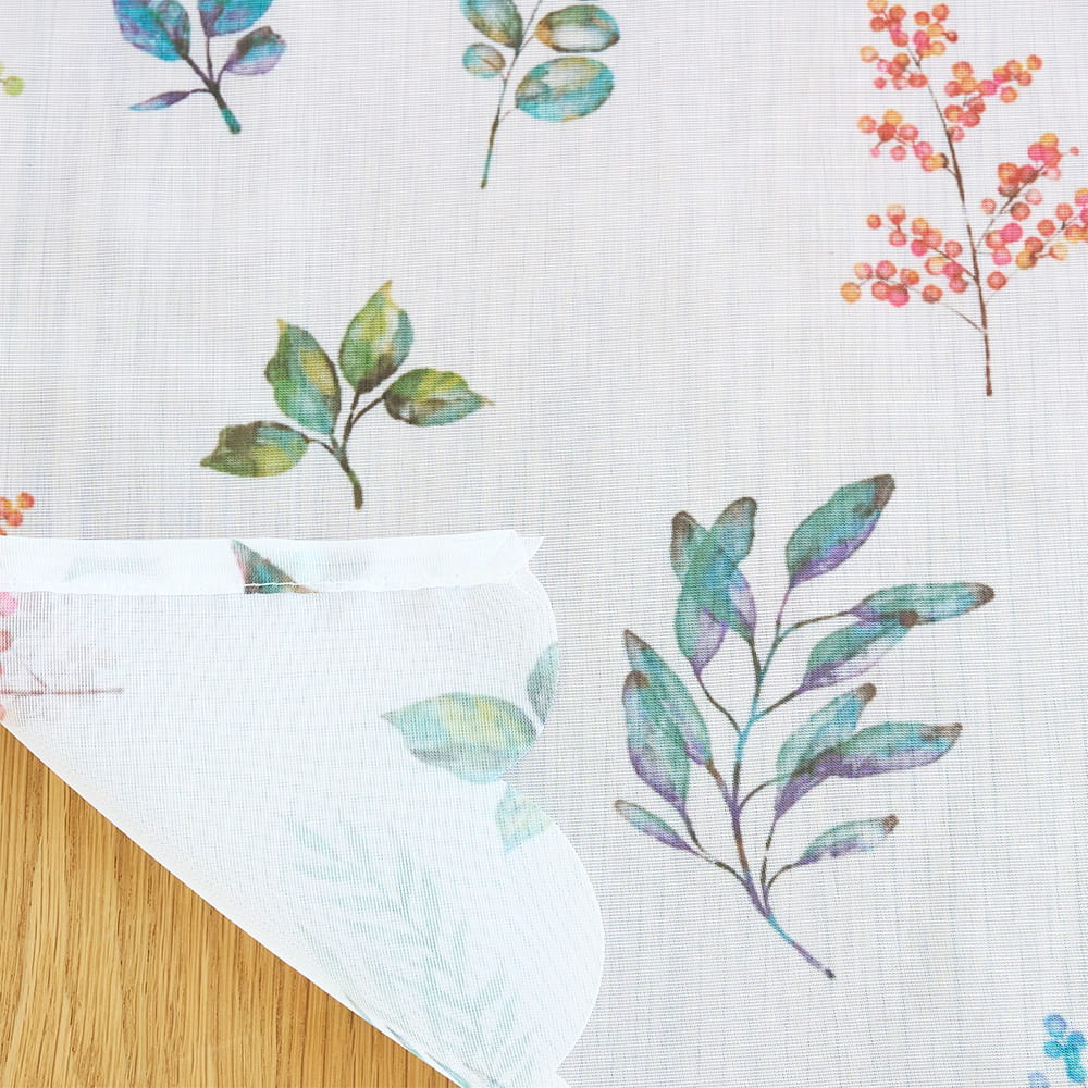 軽やかなレースに、水彩タッチの葉柄をちりばめた爽やかなカフェカーテン。
