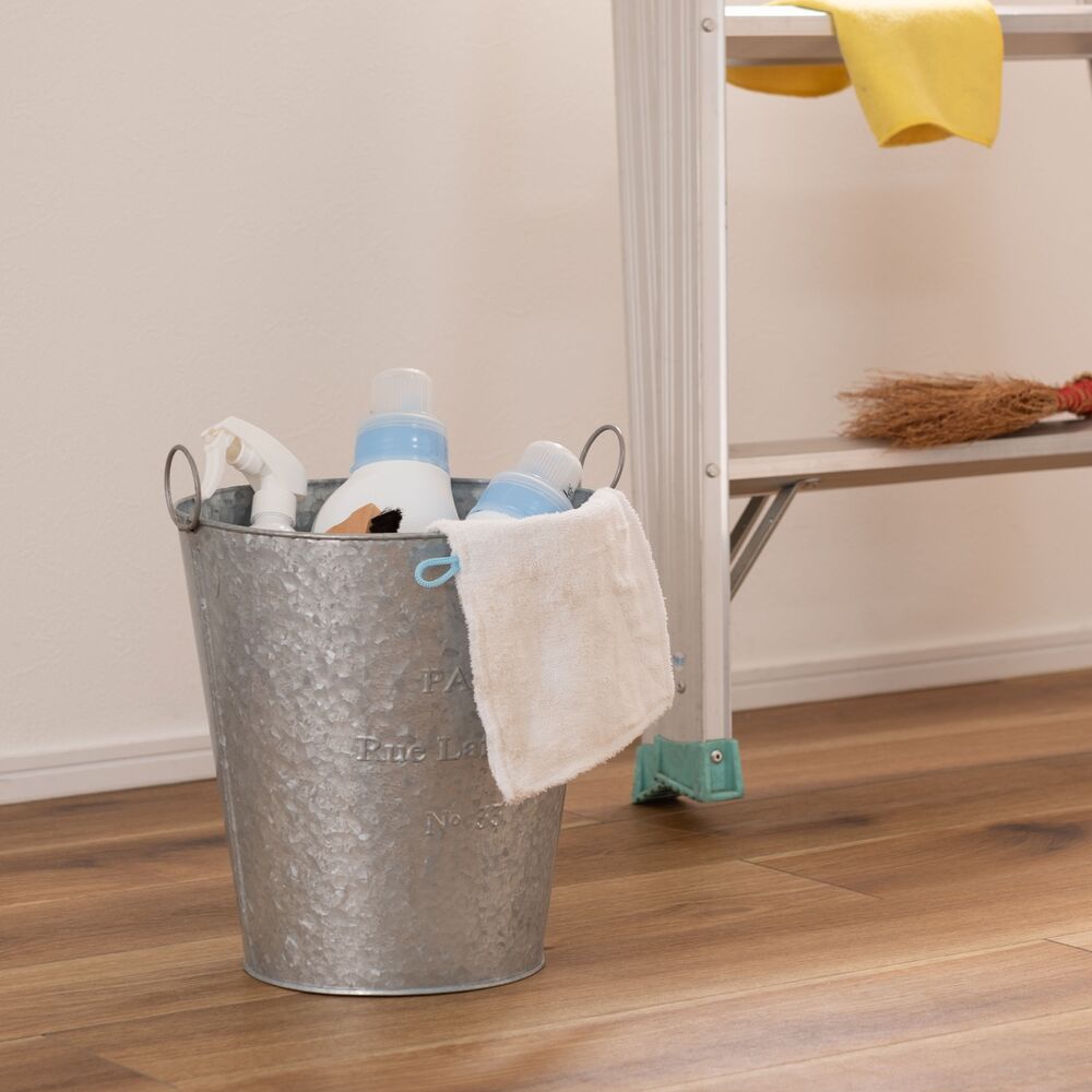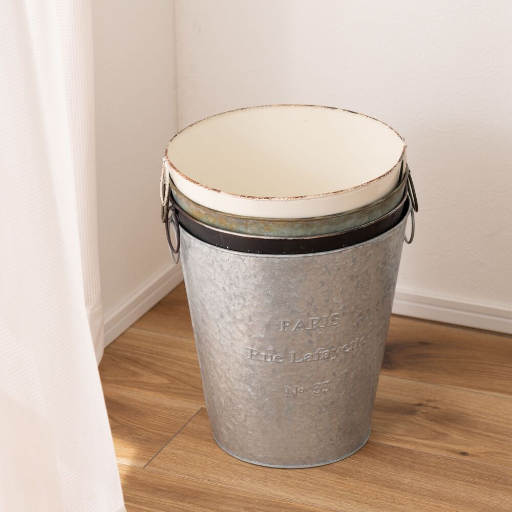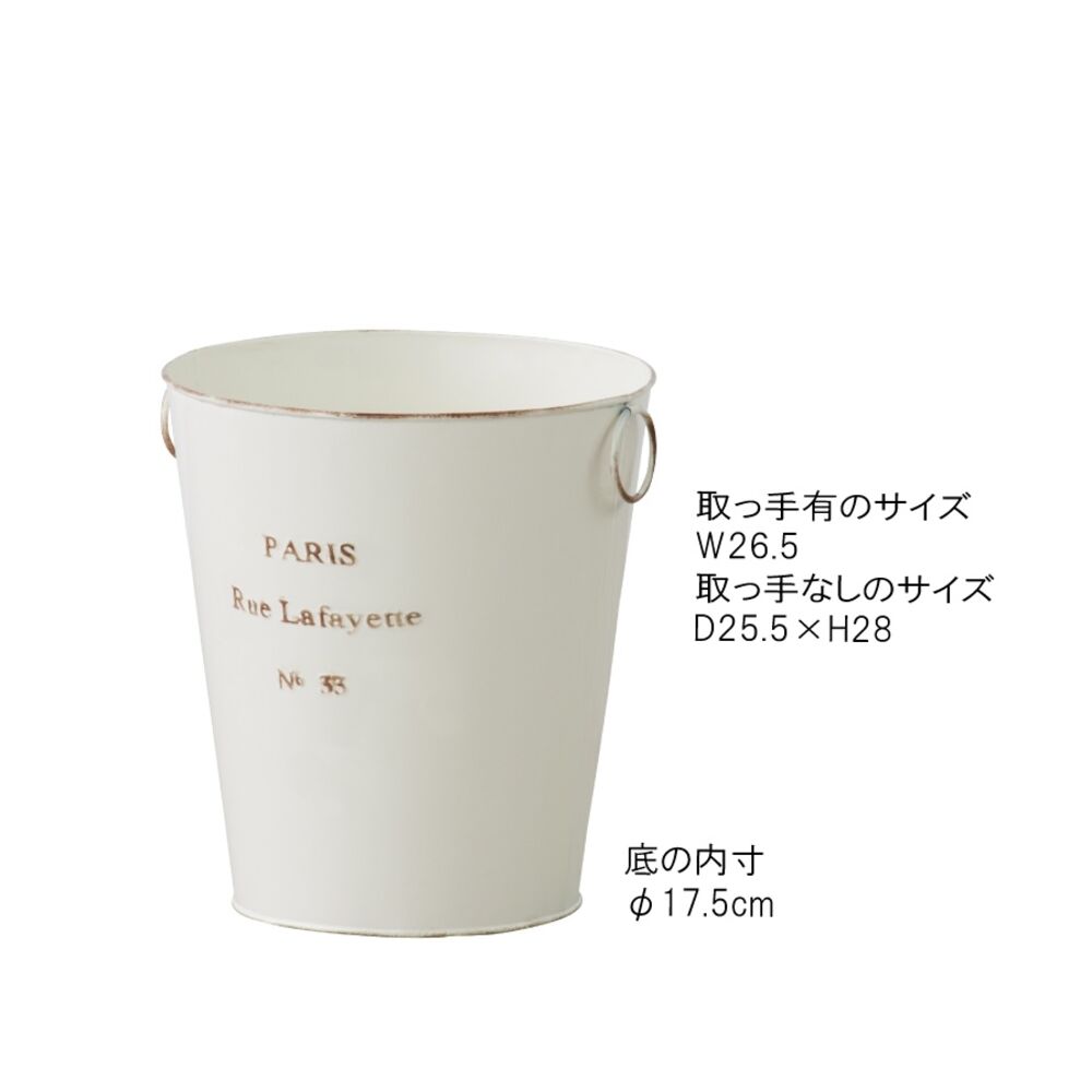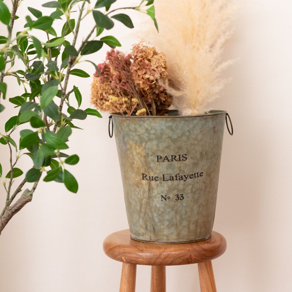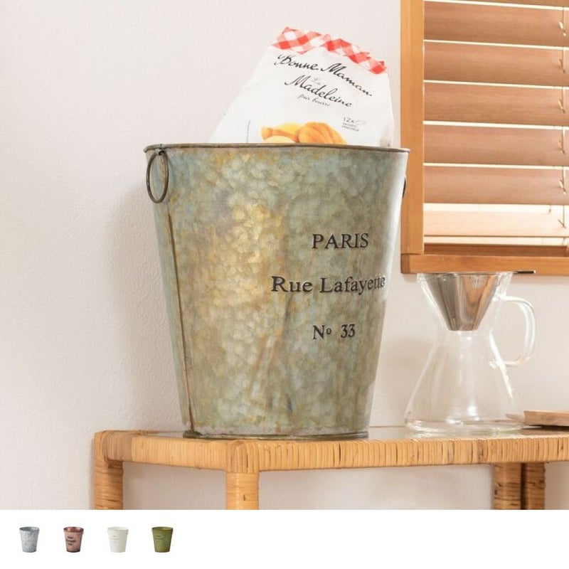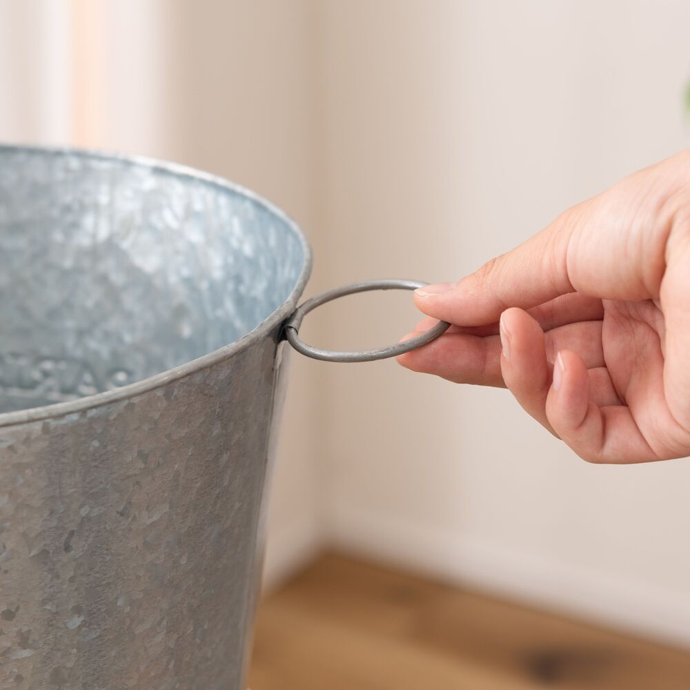 両サイドのリングは植物や小物のディスプレイにも活躍し、使い方の幅が広がる収納バケツです。