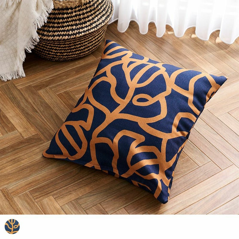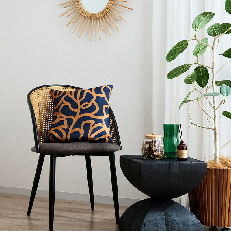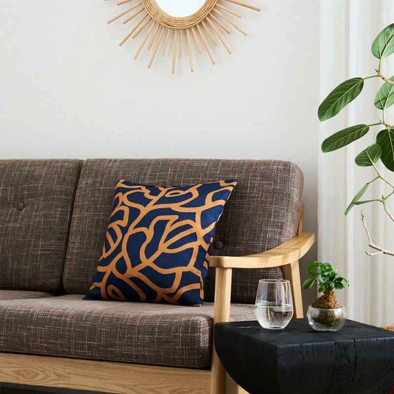 大地の魅力と自然の癒しをたっぷりと感じる、アフリカンスタイルに。エレガントな深いネイビーのベースに浮かぶ、マンダリンオレンジのリーフ柄。愛らしさがある上品でフレッシュな印象のオレンジが、お部屋を華やかに彩ります。
