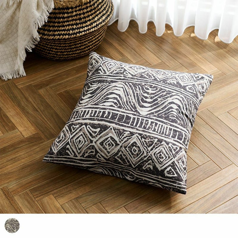 アフリカの伝統的なテキスタイルにインスピレーションを受けてデザインした、素朴なカーテンと同柄のクッションカバー。空間に温もりを与える、愛らしくもどこかとぼけたユニークさが魅力のアフリカンデザインです。