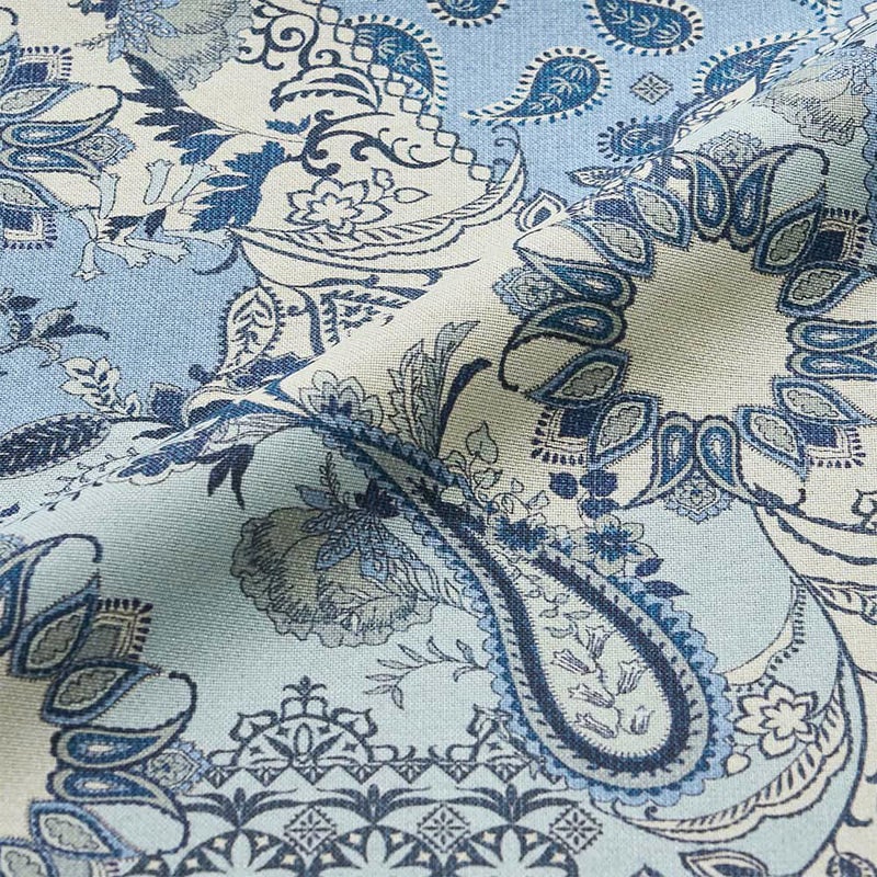 繊細に描かれた大小のペイズリー柄と、規則的に並ぶタイル柄が散りばめられた装飾性のあるデザイン。まるで、アラビアの宝石箱を開けるかのようなドキドキがぎゅっと詰まったテキスタイル。流れるように連なる黒のラインが、エキゾチックなムードを惹きたてます。